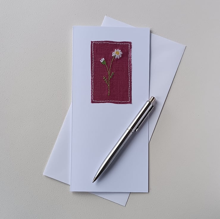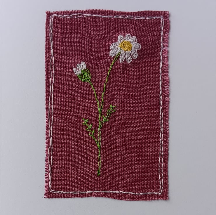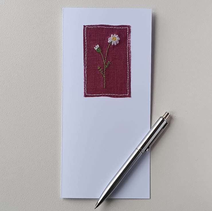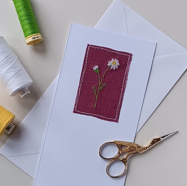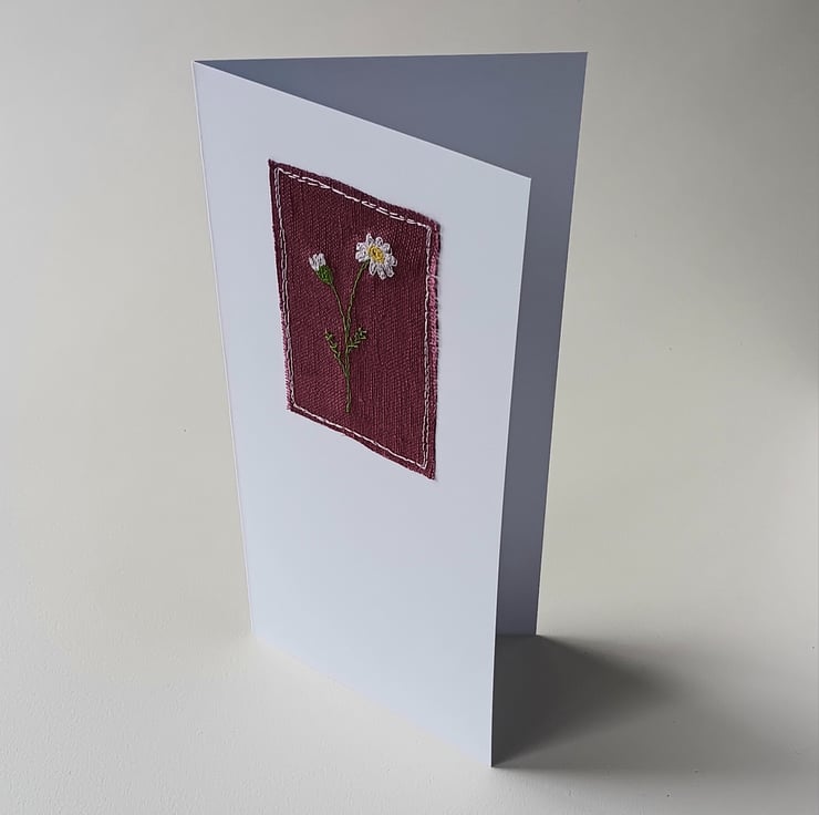 This is a general greeting card, perfect for any occasion. The design is an embroidered daisy, which has been stitched onto a lovely burgundy linen using free motion embroidery. The linen is then stitched straight onto the card.