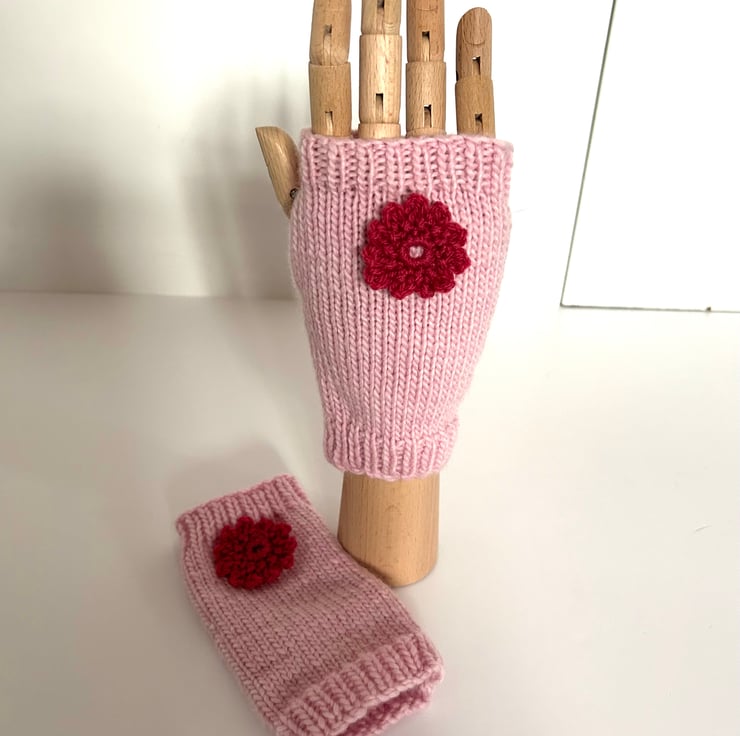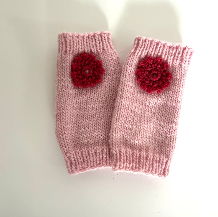 These lovely wrist warmers are knitted in a soft pink pure wool yarn and decorated with a darker pink acrylic crocheted flower. They measure 17cm in length and have a thumb hole.