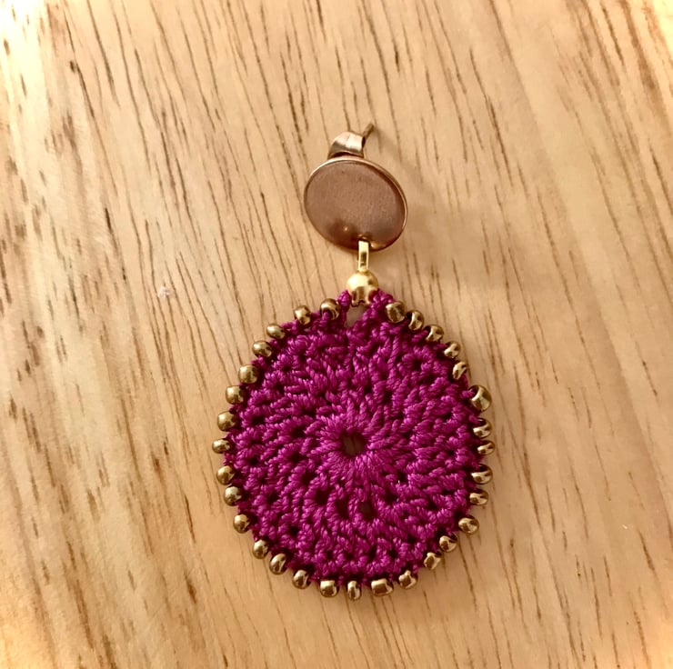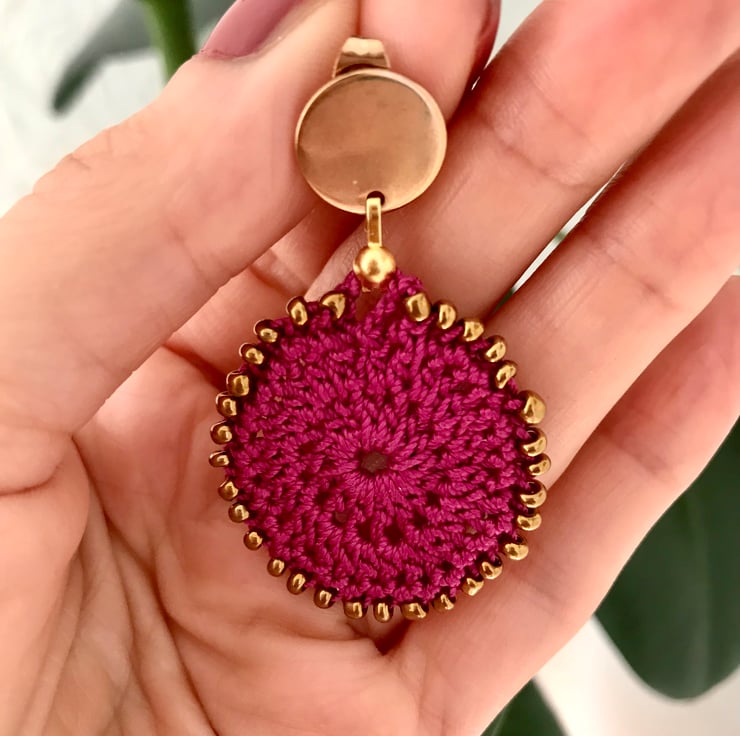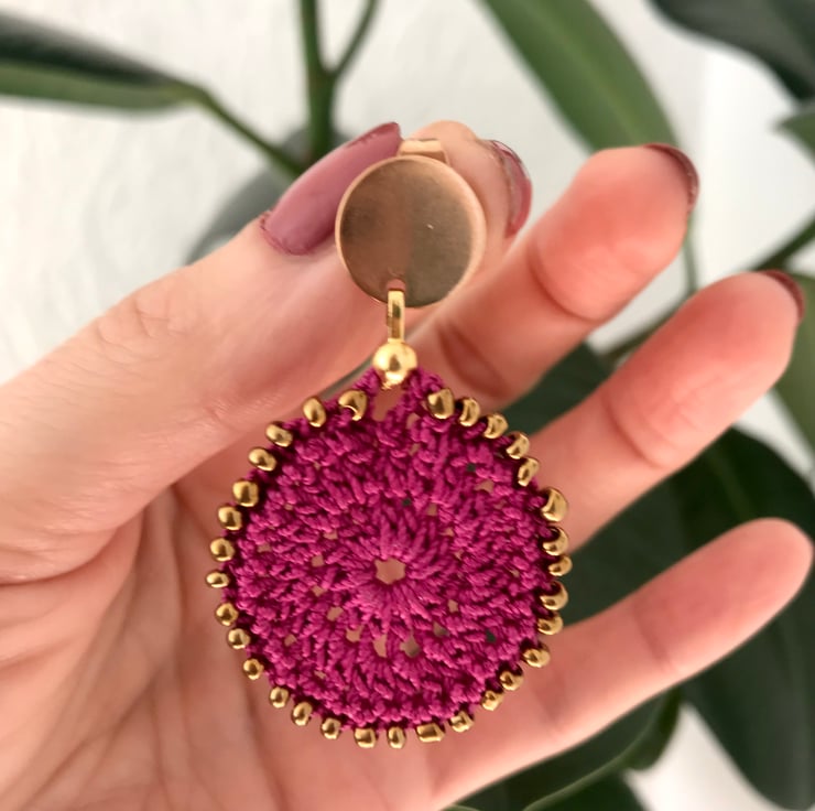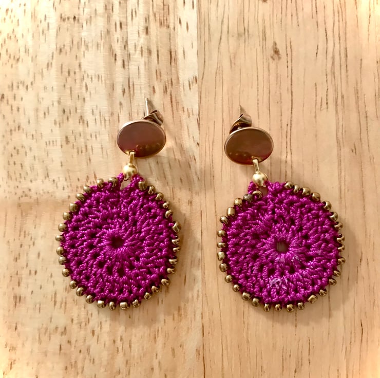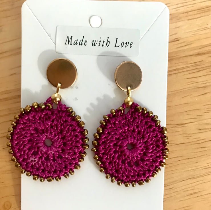 This pair of earrings have been crocheted in a rich fuchsia colour, in cottong yarn.
