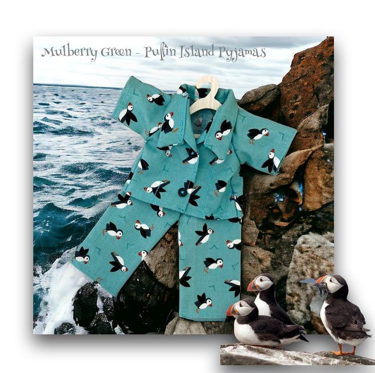 Cute little pyjamas in a puffin print, to fit the Mulberry Green characters. The pyjamas are made from best quality cotton and fasten at the front with two little poppers underneath the buttons.