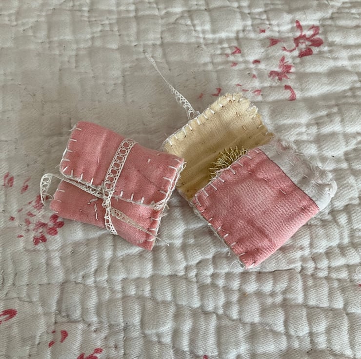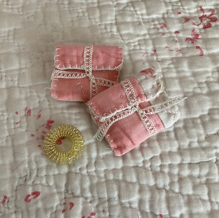 Acupressure ring in a handmade tiny vintage quilt pouch. The pouch edges are finished with blanket stitch. The pouch is closed by tying the lace which decorates the pouch. A lovely addition to your sewing kit - fits lovely in your travel sewing case.