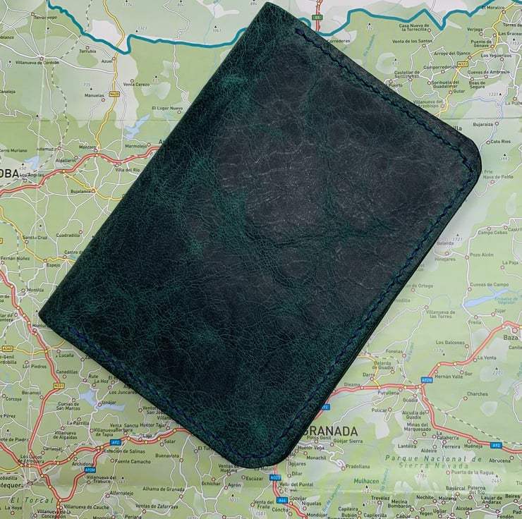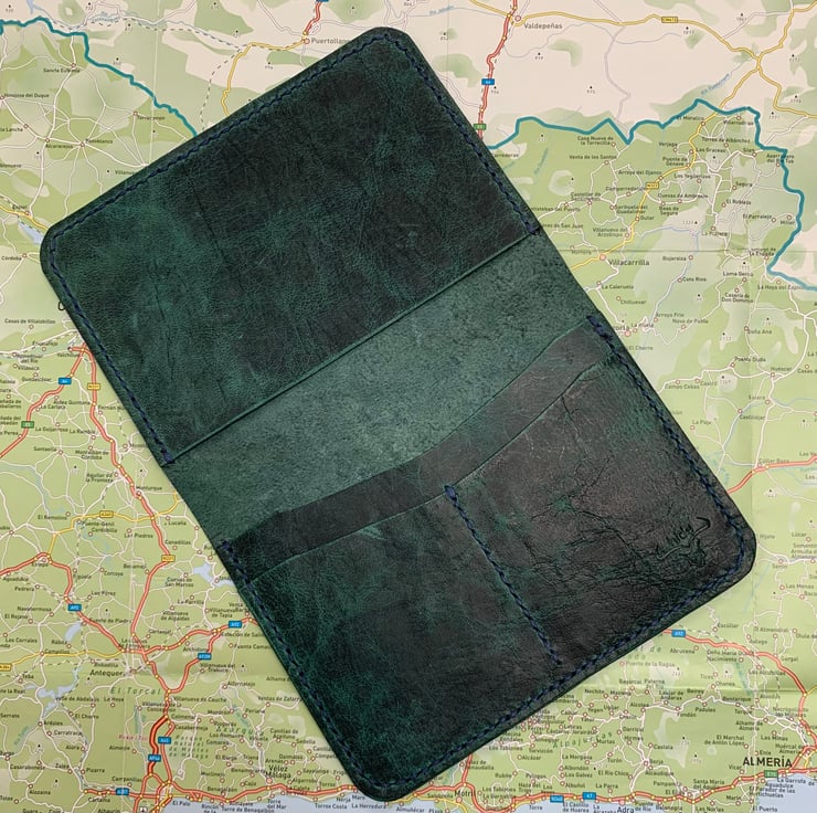 Handcrafted using fine teal leather from a tannery here in England. It's hand stitched using traditional saddle stitching with Ritza Tiger waxed thread in glossy navy blue then the edges of the leather are bevelled, burnished and polished to seal in the oils.