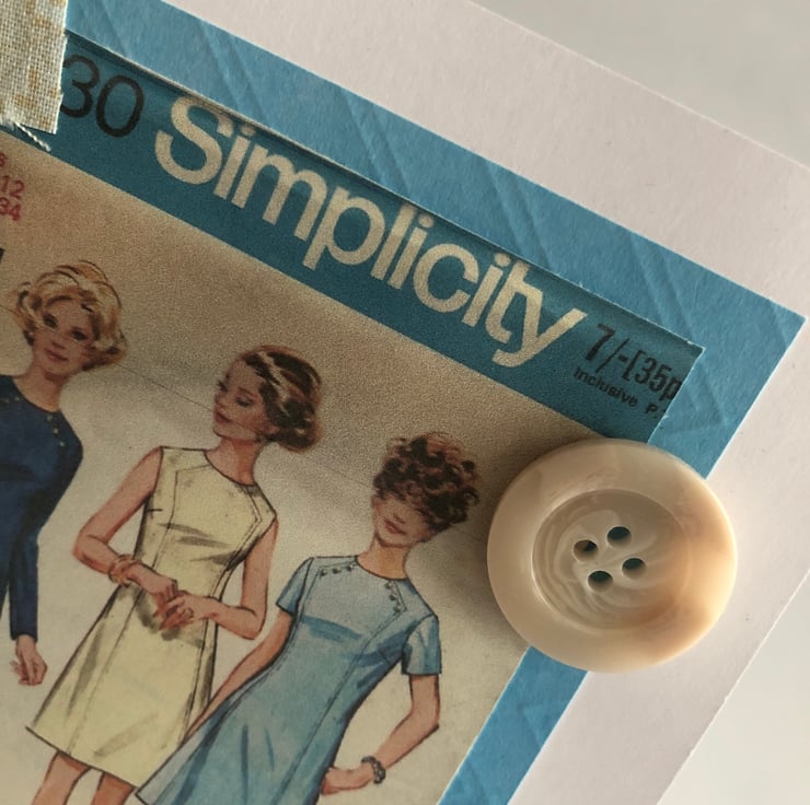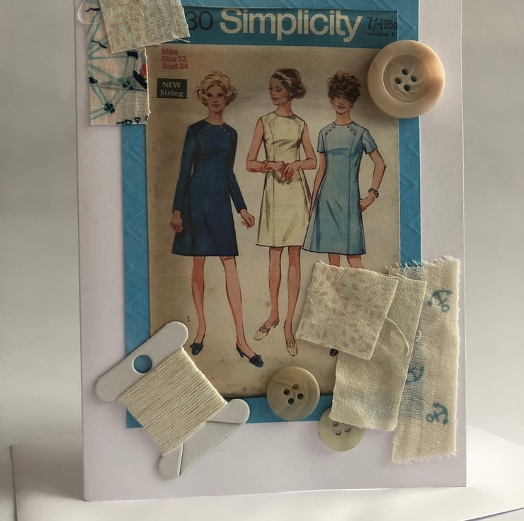 A scan of an original vintage, Simplicity 8330, sewing pattern from 1969 has been used to create the theme for this 7" x 5" card, which has been embellished with fabric scraps, buttons and embroidery thread in blues and creams. Marks on the pattern are from the original picture. Ideal for the creative person in your life! Can be used as a birthday card, get well, or retirement card (left blank for your own message) or if you put it in a box frame, can be used as wall art!