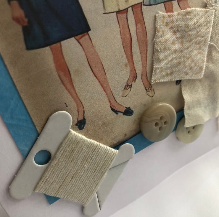 Designed to represent a mood-board, these cards have been created by combining prints of my own sewing patterns with themed ink stamps, vintage buttons, various fabrics, and, coloured thread and papers to match.