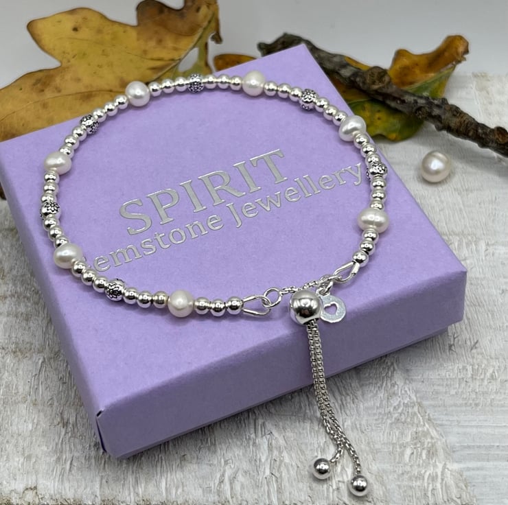 Hand made fresh water pearl and sterling silver adjustable bracelet , pearls are alternated with pretty embossed flower beads and finished with on trend adjustable bolo clasp.