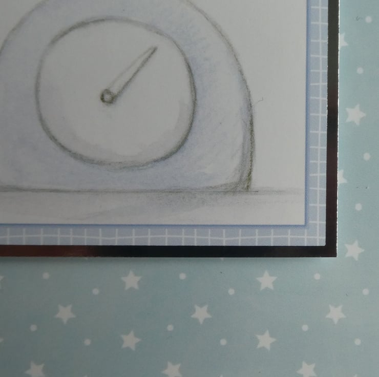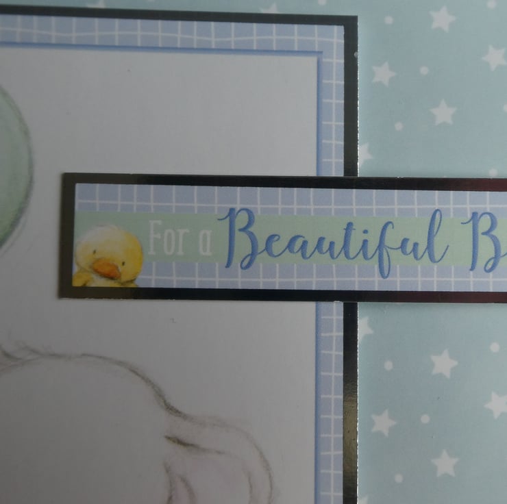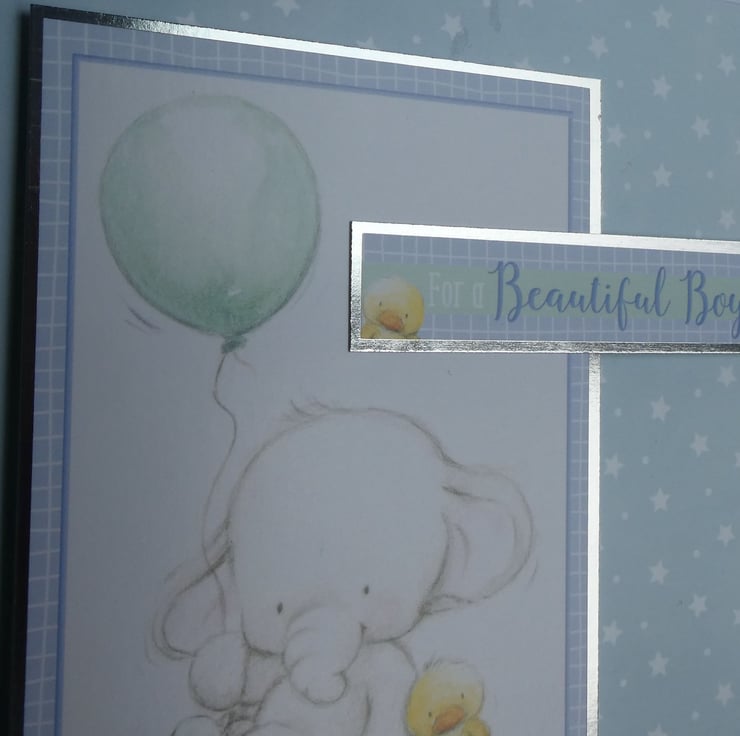 Printed on quality gloss card in shades of pale blue, aqua, lemon and white with silver foiled details the main image shows a sweet elephant holding an aqua balloon as it sits on retro style scales with a cute yellow chick. The image is framed with a silver foiled edge and raised on foam pads from the background card which has a design of off whitestars on a pale blue background.