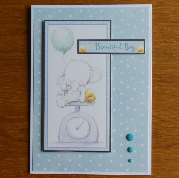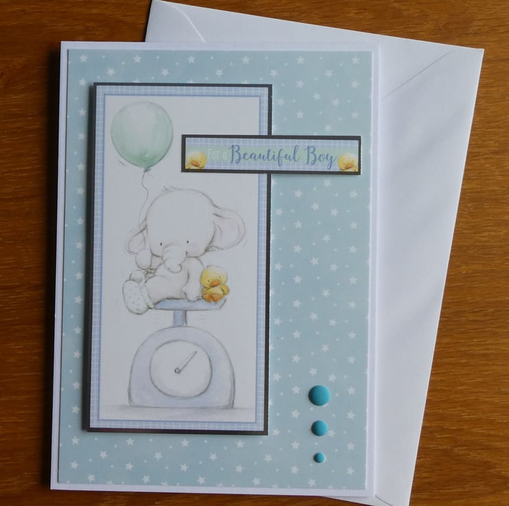 This one of a kind card New Baby card with an image of an elephant and a chick sitting on scales would be ideal to send to celebrate the birth of a baby boy.