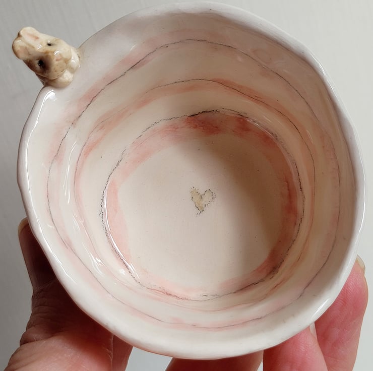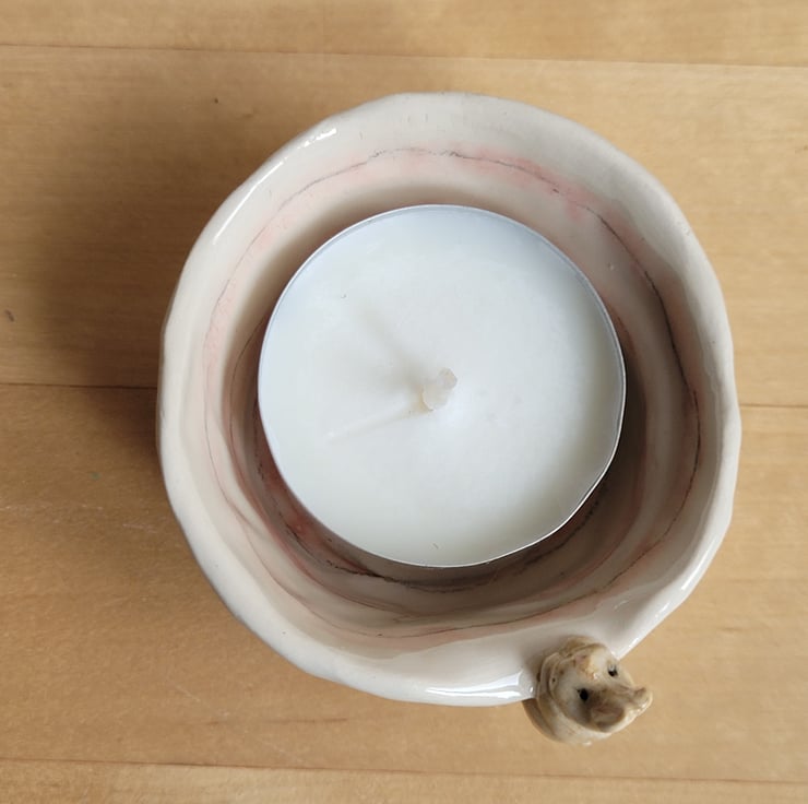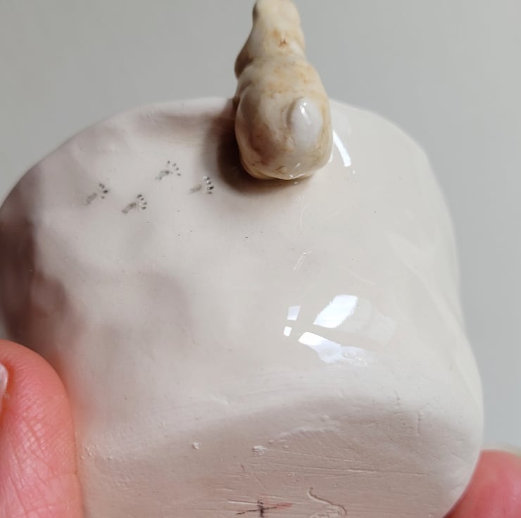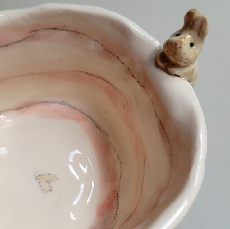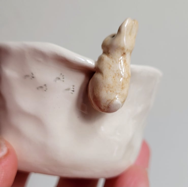 Hand pinched little tealight pot. The bunny was modelled and attached prior to bisque firing along with footsteps pushed into the clay . The piece was then hand painted and the whole pot dipped in clear lead free glaze prior to the final firing .