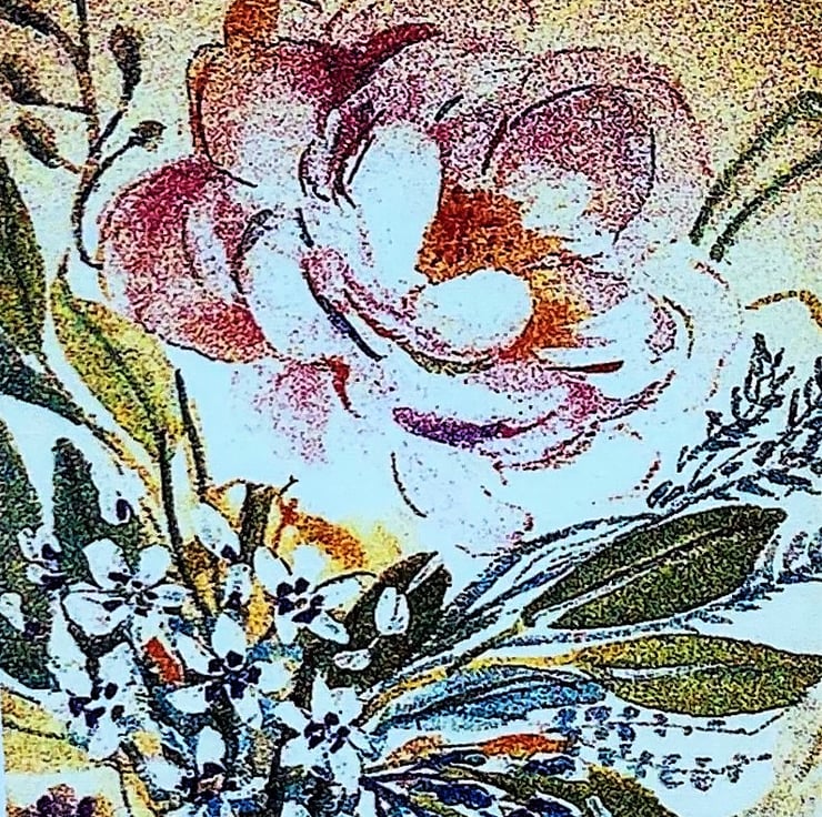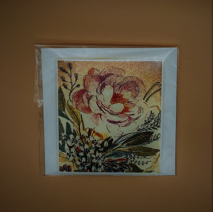 Taken from one of my original watercolour paintings this little card is a charming way to send your own message on any occasion. The card shows a floral arrangement with a pink rose surrounded by other mixed flowers and grasses. The colours are subtly muted and the card image is manipulated to give a slight 'film grain' finish which lends air of vintage glamour to the print.