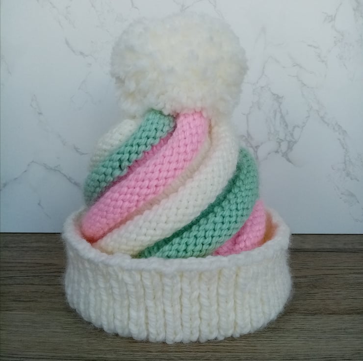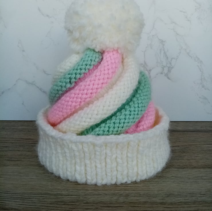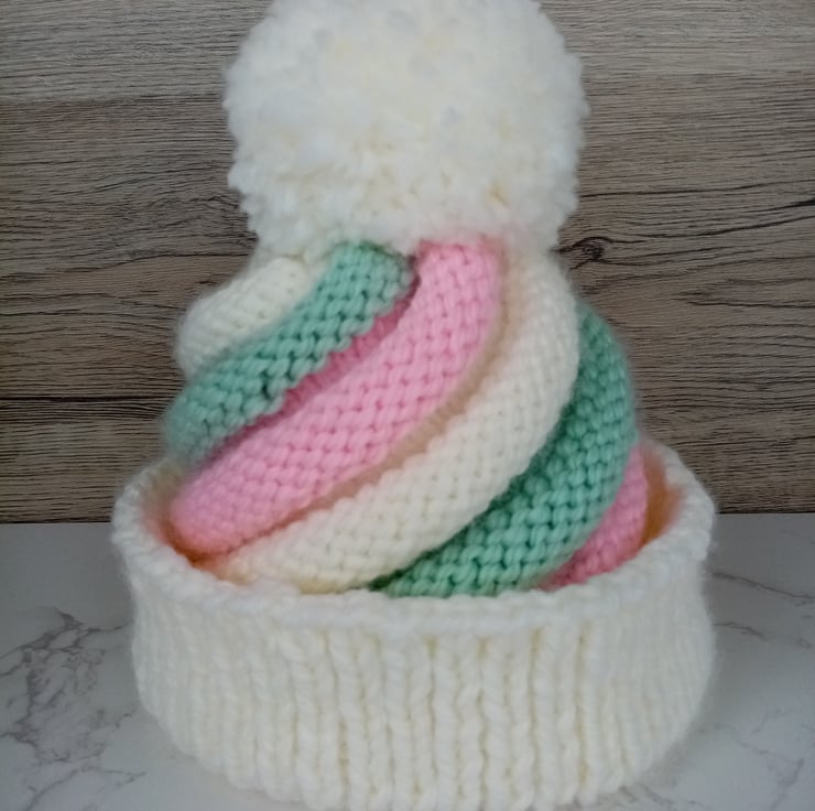Cupcake swirl hat in soft comfort chunky cream, pink and mint green topped off with a cute cream bobble.