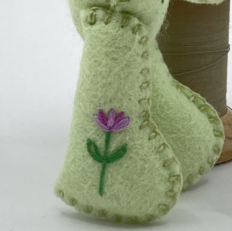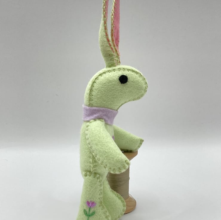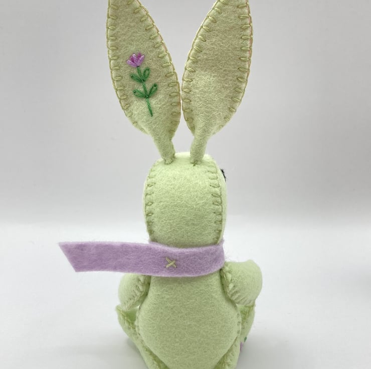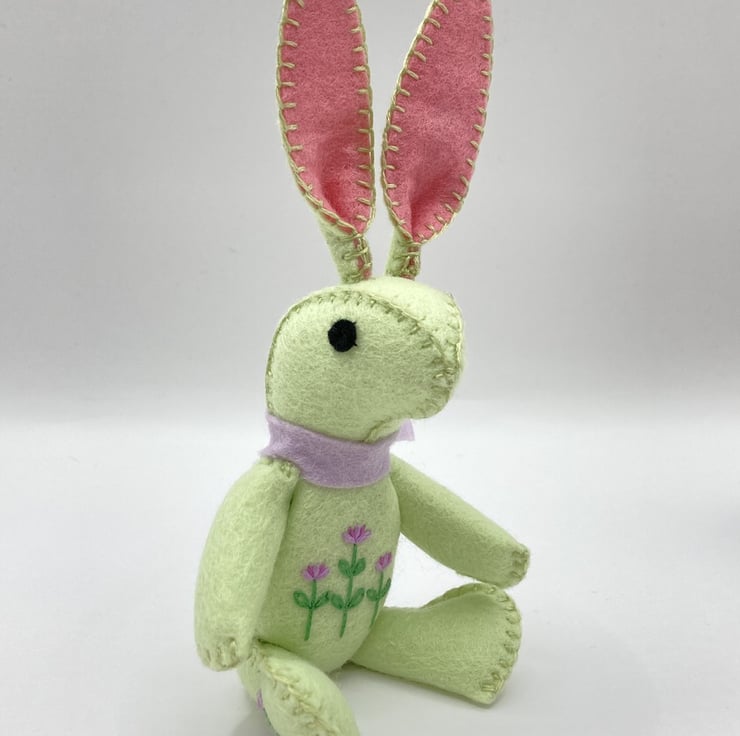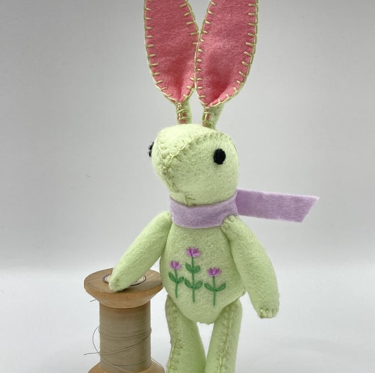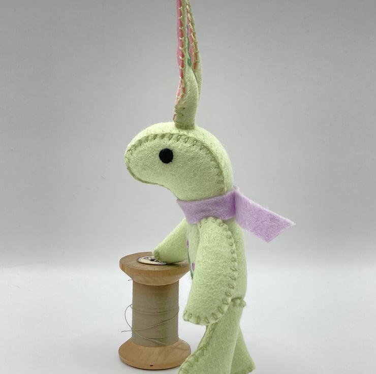 I have used pastel green wool felt to make Bunny’s body which I have lovingly filled with regulation Hi-Loft polyester toy stuffing.