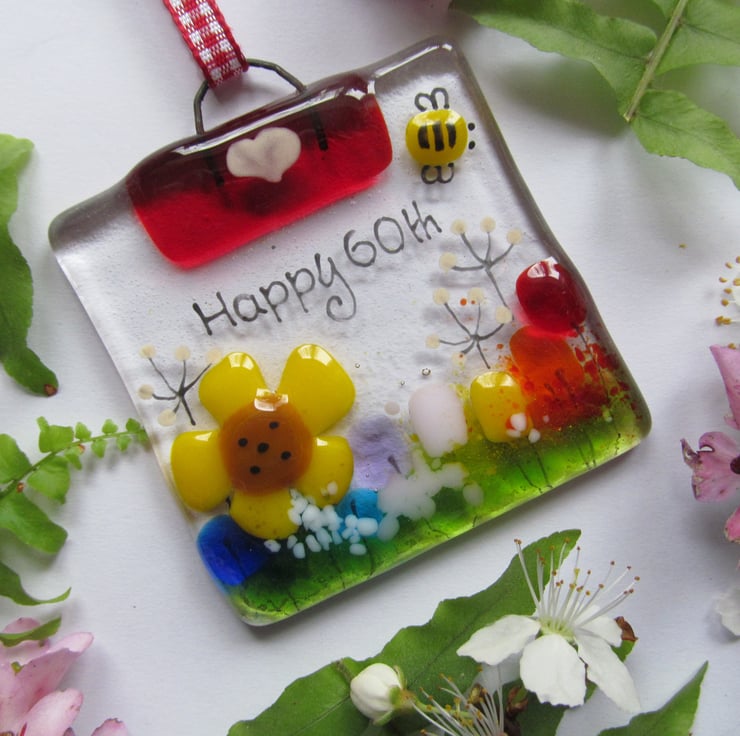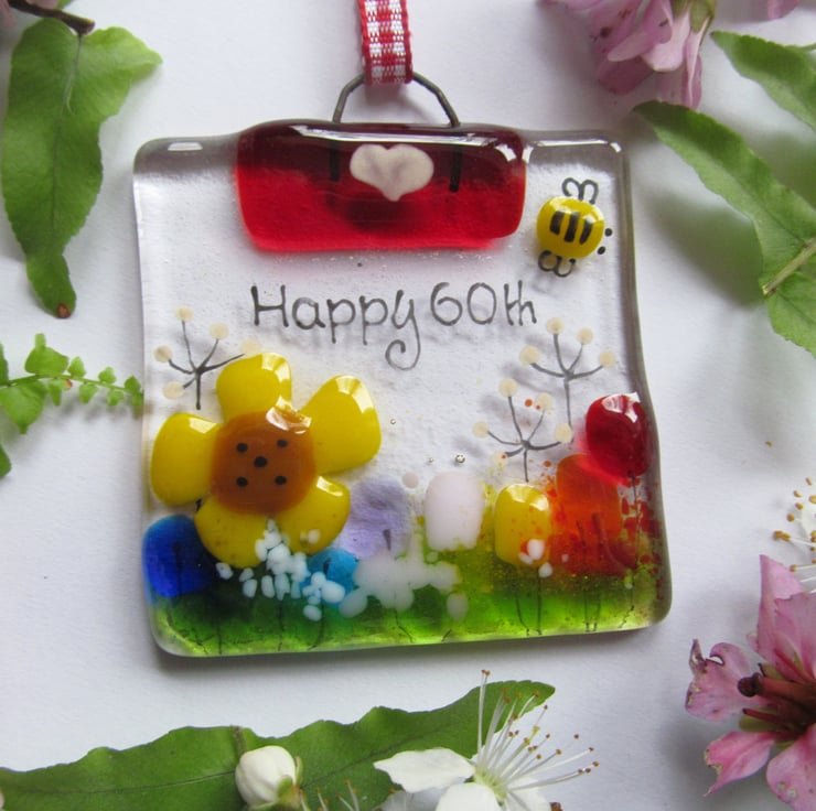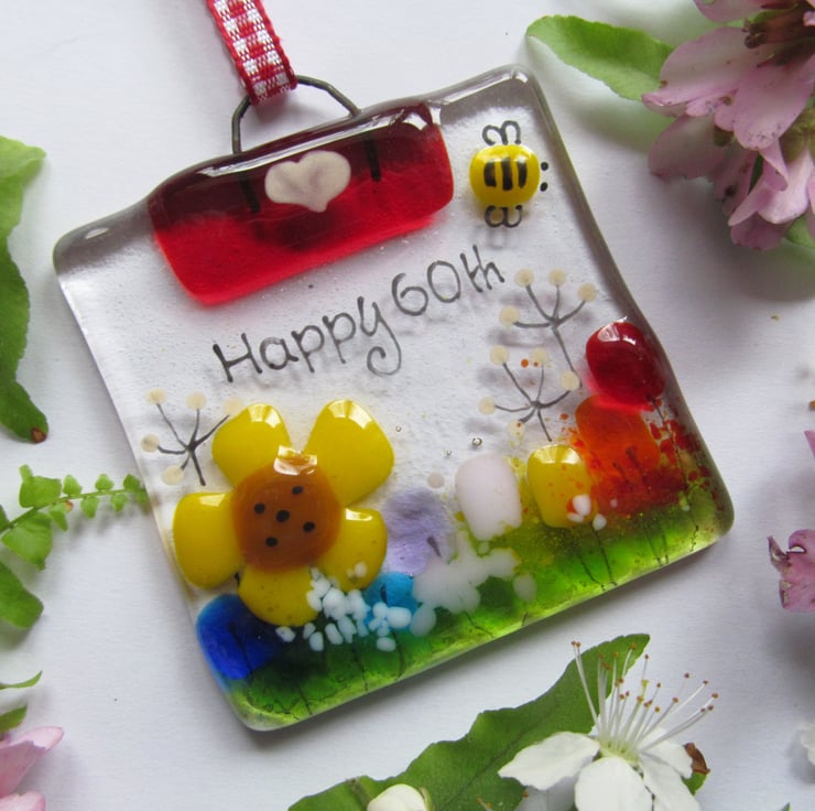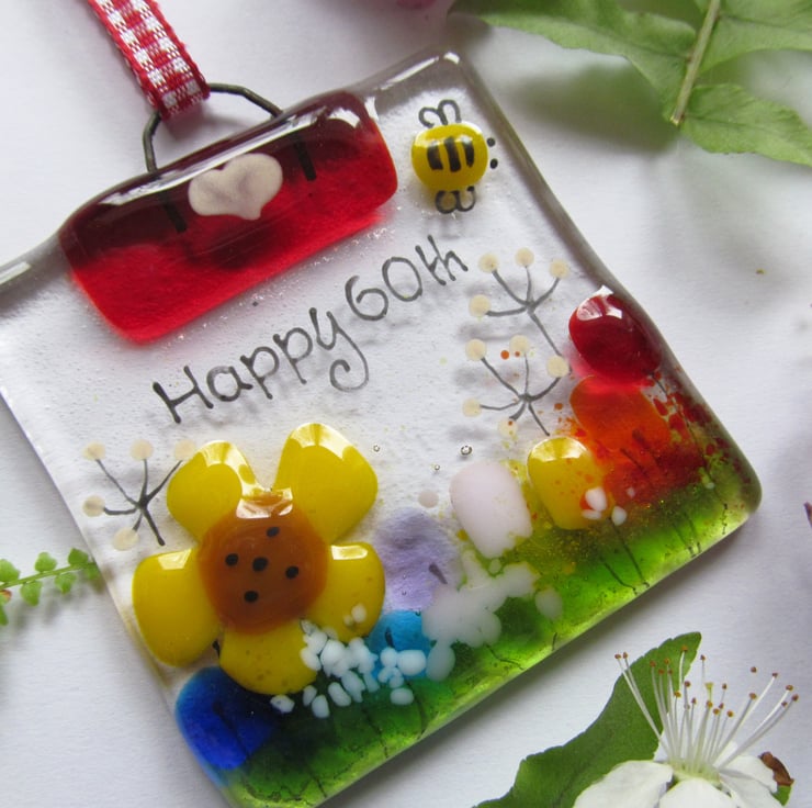 This hand made, fused glass mini suncatcher makes a unique gift for anyone celebrating their 60th birthday. Being mini size, it's ideal for popping in with a card or letter and the recipient can hang it at a window or in a conservatory and remember their birthday milestone.