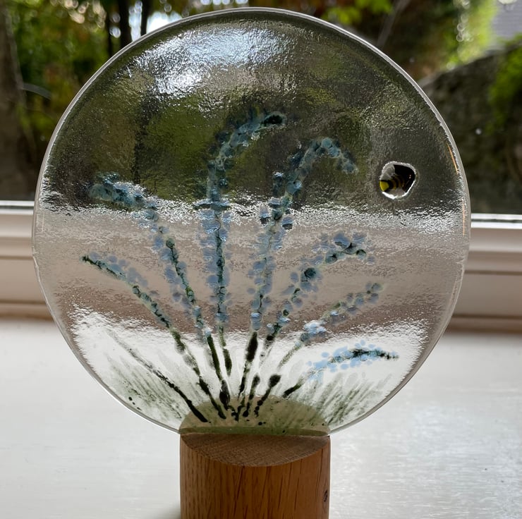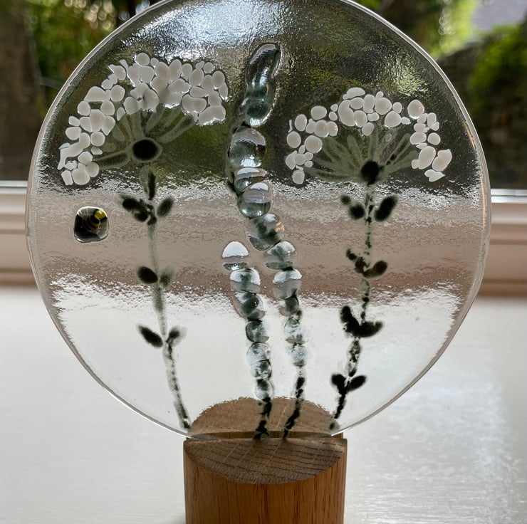 These 10x15 cm (including oak stand) fused glass flower circles look beautiful on a sunny windowsill and a candle can be lit behind them to show the detail of the design.