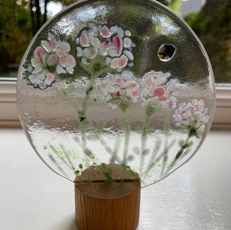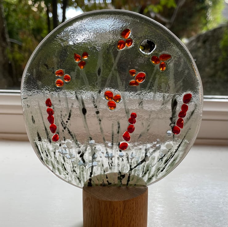 Each one sits within an oak base. The designs have been hand painted with different sizes and colours of frit which is crushed glass. A tiny bee can be found somewhere near each flower to complete the design. The price is for each piece. Please say which one you would like……PINK, WHITE ,BLUE, RED/ORANGE