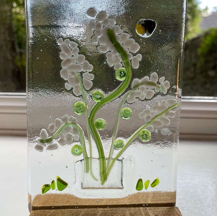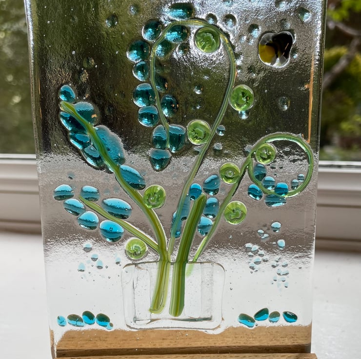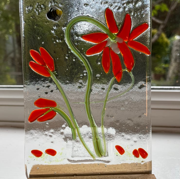 These 10x15 cm (and 2cm h oak stand) fused glass vases of flowers look beautiful on a sunny windowsill and a candle can be lit behind them to show the detail of the design.