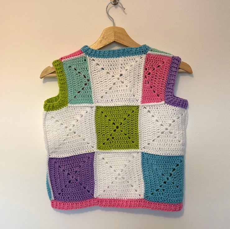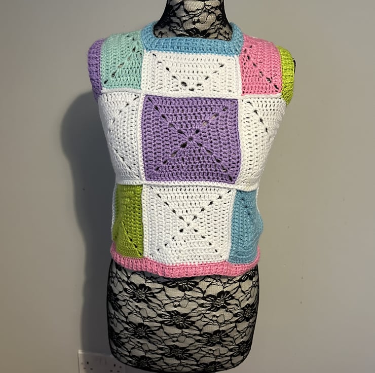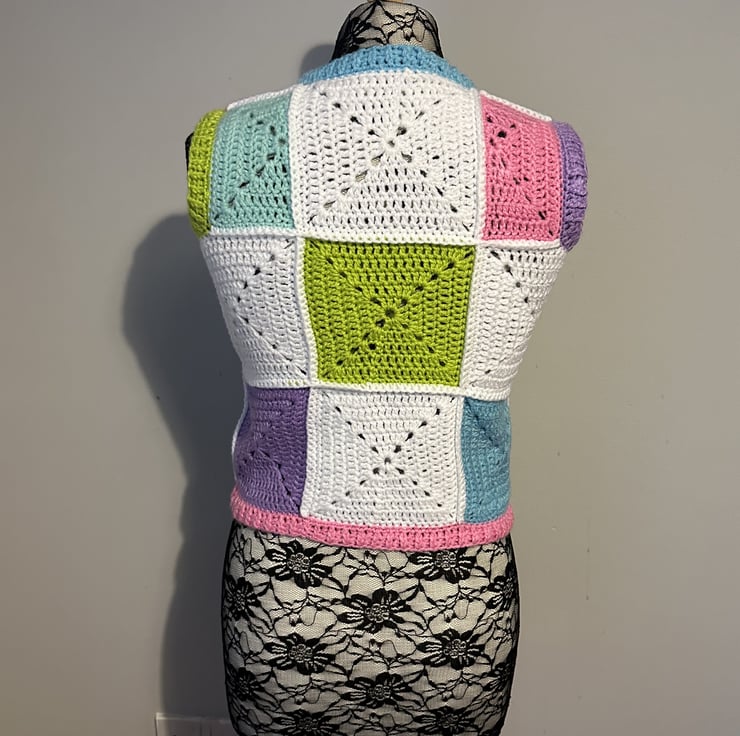 The vest is a size small measuring 16.5 inches from underarm to underarm and 17.5 inches from collar to base.