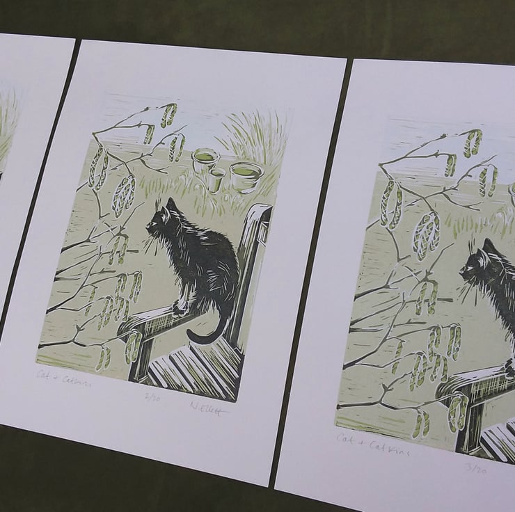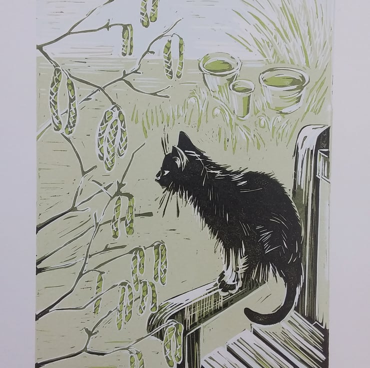 'Cat and Catkins' - a five colour reduction linoprint in light greens and black.