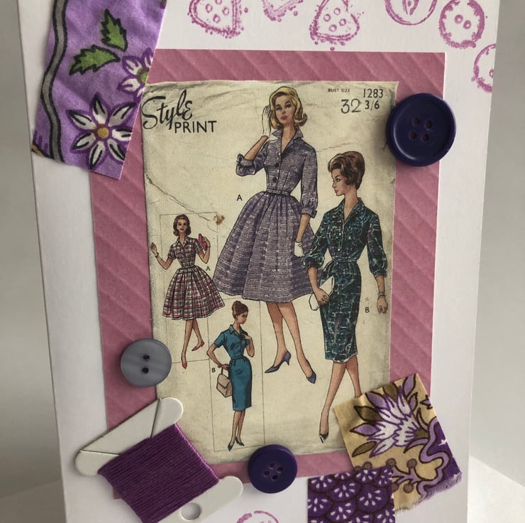 The pretty fabrics highlight the deliciousness of this mid-century 'Style' sewing pattern print. The card has been embellished with various buttons and purple embroidery thread creating a mood-board card for someone who loves crafts and all things sewing or vintage. Buttons have been ink-stamped onto the card to help bring the shades of lavender, purple and pink together and add an extra layer of loveliness!