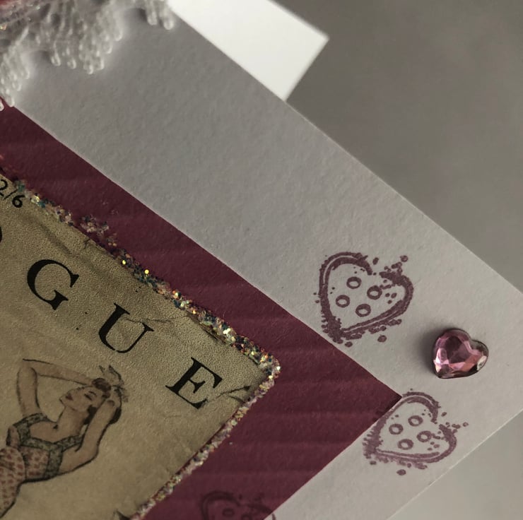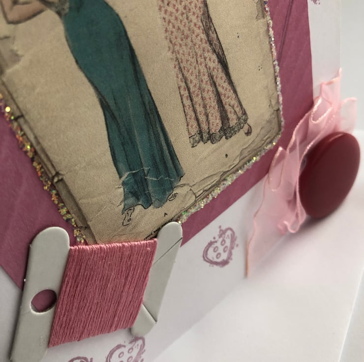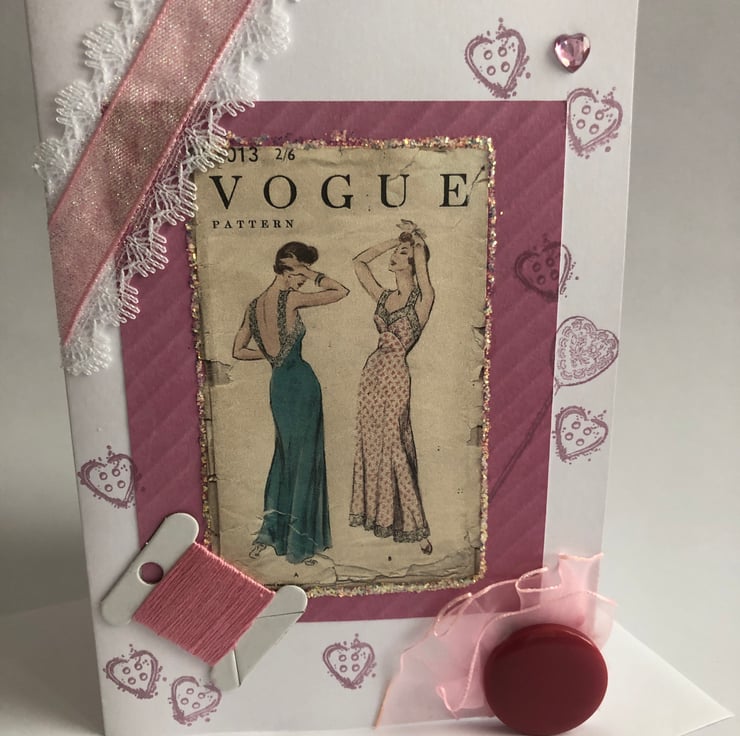 Using a print of a 1954 Vogue underwear/nightdress sewing pattern this 7" x 5" card has been embellished with glitter glue, embroidery thread, ribbons and a vintage button, then decorated with ink stamped haberdashery items and finished with a plastic pink love heart. This would make the perfect card for a crafter or lover of vintage imagery. Help make someone's occasion become a little bit more special!