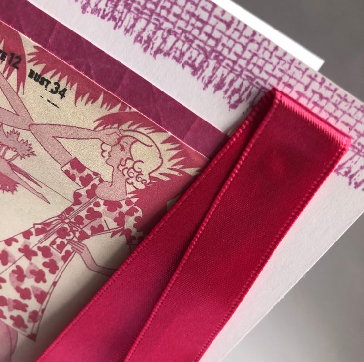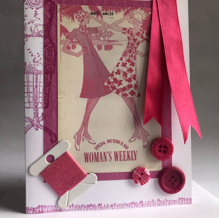 A zipped front, retro summer dress is the main focus for this blank inside, 7" x 5" embellished card. Pink ribbon, embroidery thread and buttons, along with pink ink-stamped haberdashery pictures combine to create a unique card for a lover of all things vintage, sewing, craft or ephemera.