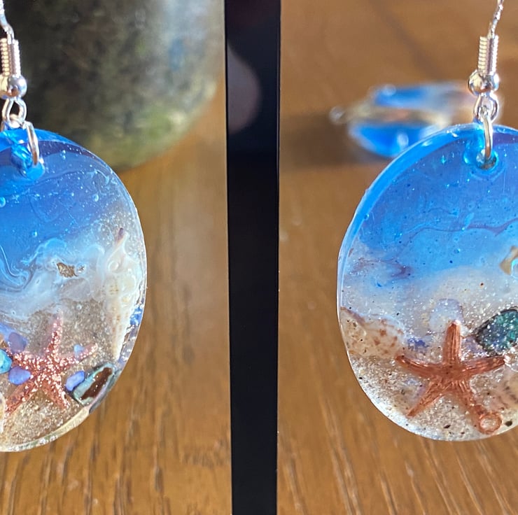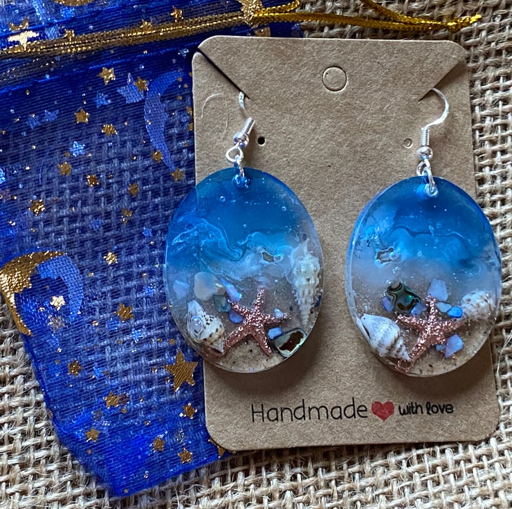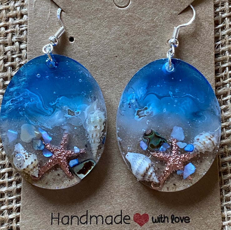 This is pair of handmade seascape resin earrings. It features the beach which contains real sand and has a variety of seashells embedded in it including abalone shells both natural and blue coloured. Nestling amongst the shells is a small metal starfish. The sea has been died blue with white paint representing the waves. The earrings are packaged on a card background in a lovely organza bag. It is posted via 2nd class Royal Mail.