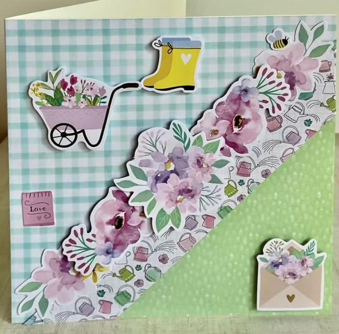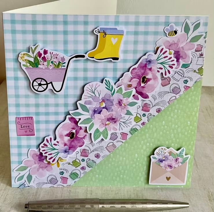 This handmade card features a multilayered background of green gingham, green spotty and watering can paper panels.
