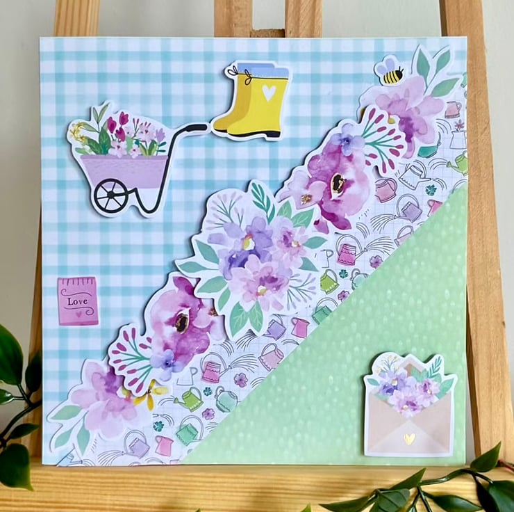 The card features raised die cut flowers, a wheel barrow filled with flowers, welly boots and an envelope filled with flowers with a little sign simply saying love.
