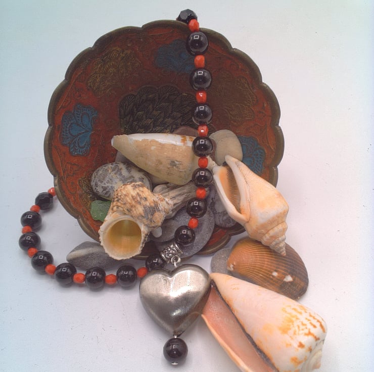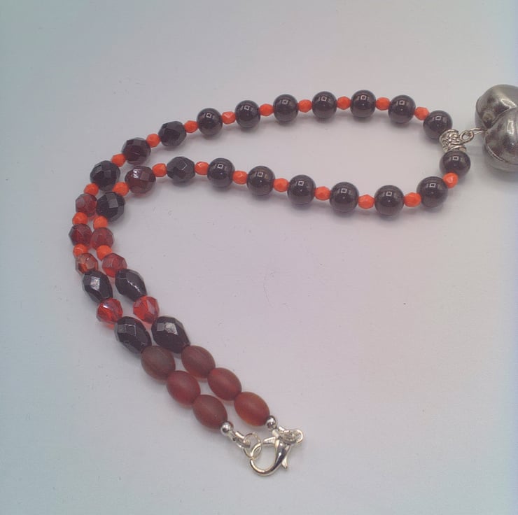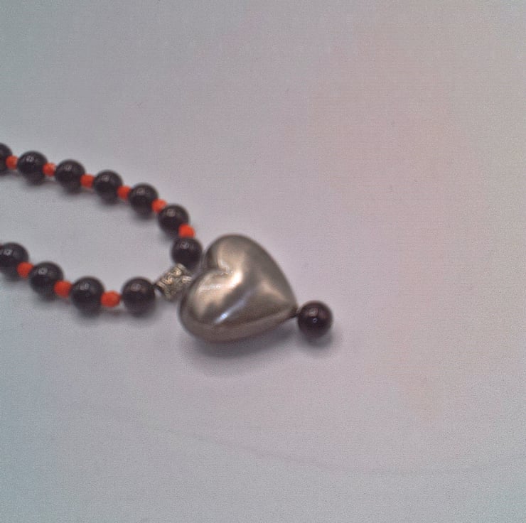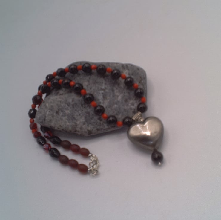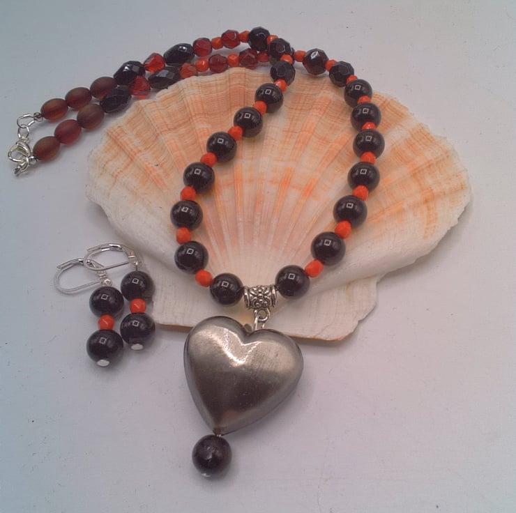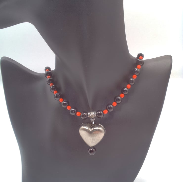 This very striking jewellery set comprises a necklace with a brushed metal heart pendant and a pair of earrings. The necklace is made using an assortment of red and black beads ranging from small 4 mm opaque red faceted beads, 8 mm round black beads and a mix of red and black crystal beads with a 25 mm x 25 mm brushed metal heart pendant suspended on a silver plated bail at the centre. It is fastened with a silver plated lobster clasp. The earrings are made with the 8 mm round black beads and a 4 mm red faceted bead suspended on silver plated lever back ear wires. The necklace is 16.5 inches ( 42 cm) in length, with a drop of 1.25 inches (3 cm) for the heart pendant and the earrings have a drop of 1 inch (2.5 cm) from the base of the lever back. The set will be dispatched wrapped in tissue paper in an organza bag and delivered via Royal Mail first class post. It would be great to wear for a party or other casual time and it would be a perfect gift idea for any girl or lady.