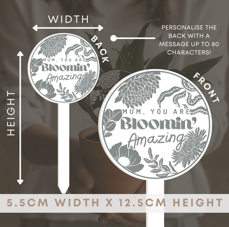 Surprise your extraordinary mum with our "Bloomin' Amazing" engraved acrylic plant plaque, the perfect Mother's Day gift that celebrates her nurturing spirit. Show your gratitude and appreciation for all she does with this unique and meaningful gesture. Let your mum know she's not just a mum, but a bloomin' amazing one!