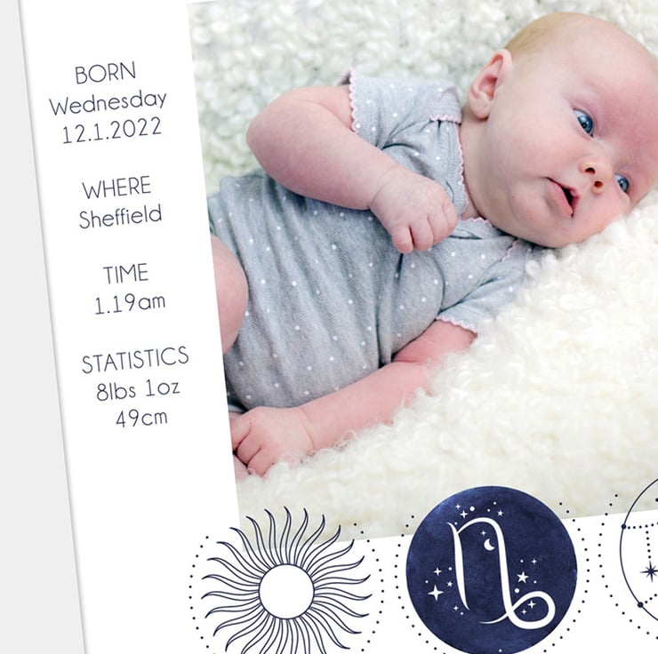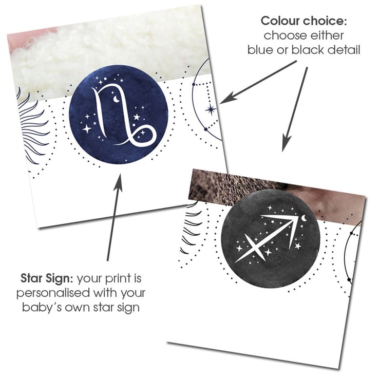 Simply supply the key birth details and I'll also include you baby's star sign, birth flower, birth stone and the meaning of their name. Each print is further personalised with the baby's zodiac star sign. The print will fit into any standard 10x10" picture frame.