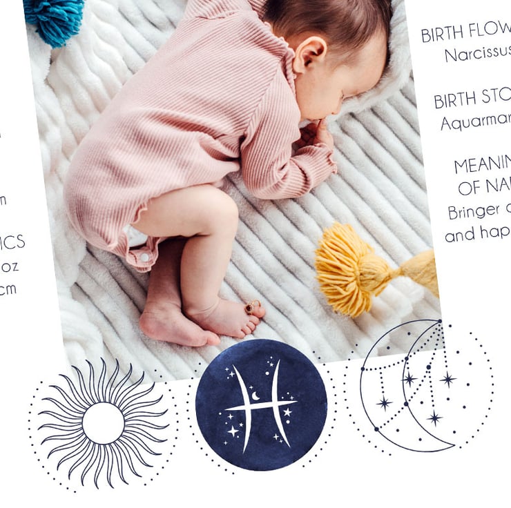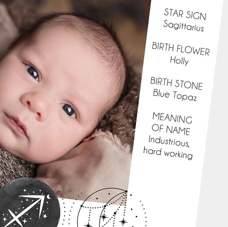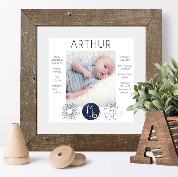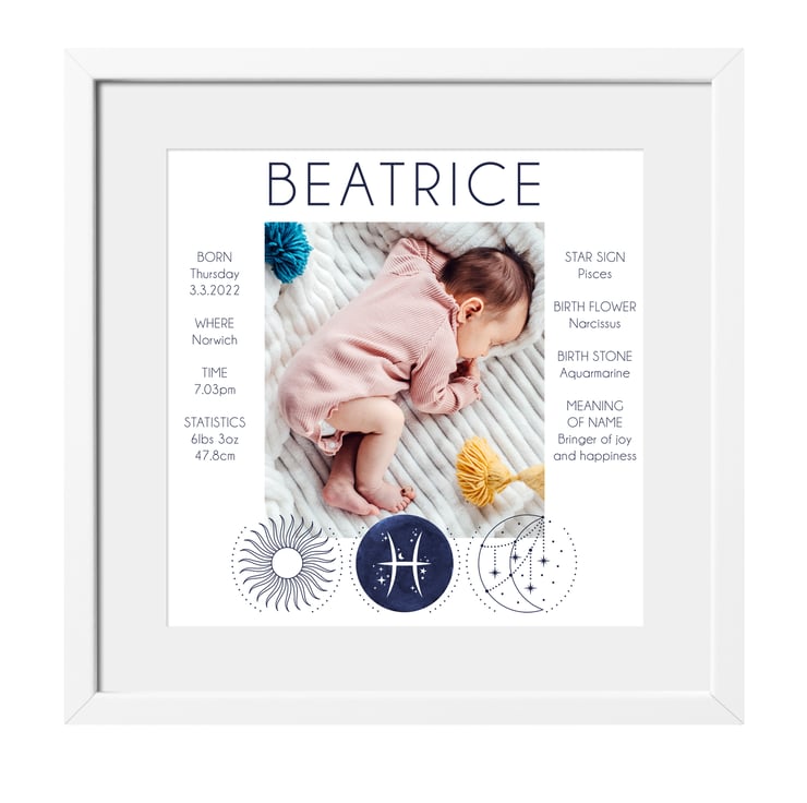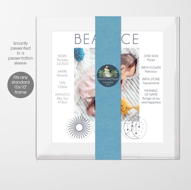 Simply supply the key birth details and I'll also include you baby's star sign, birth flower, birth stone and the meaning of their name. Each print is further personalised with the baby's zodiac star sign. The print will fit into any standard 10x10" picture frame.