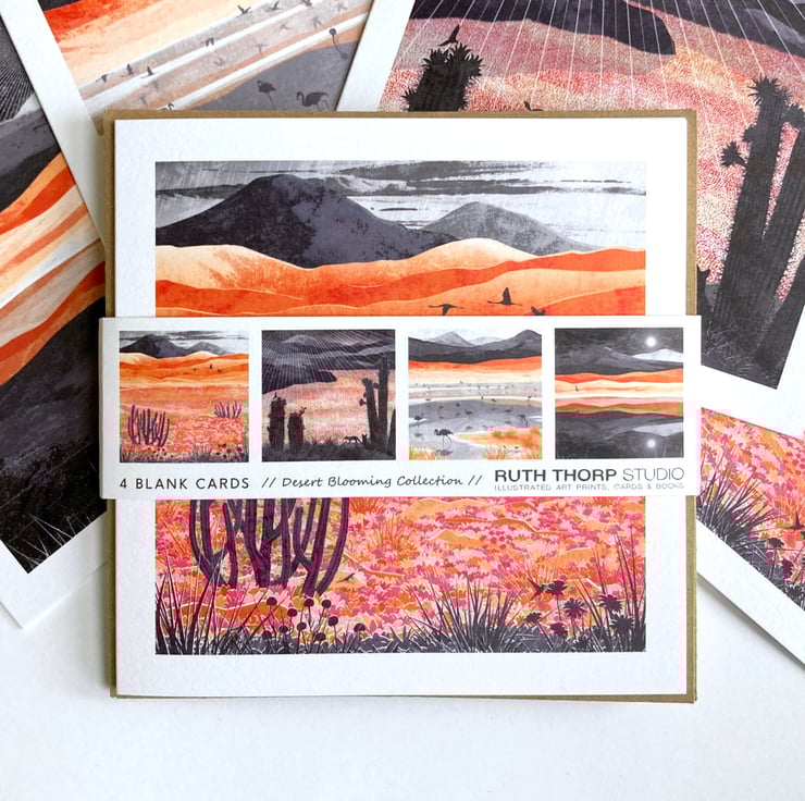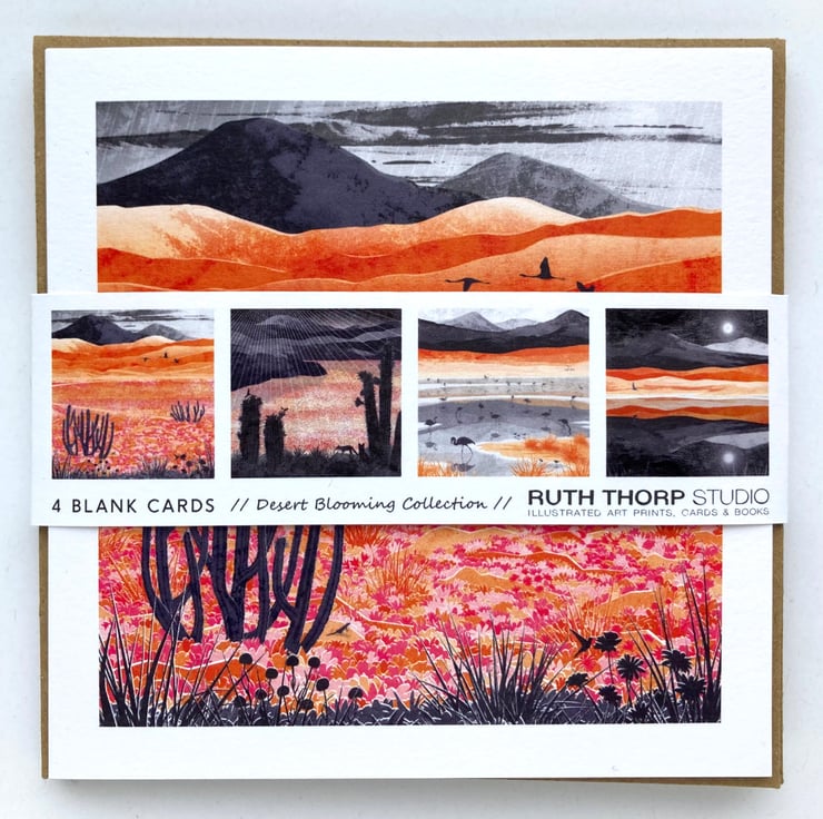 Including inspiring day and night scenes from the desert including salt flats, flamingos, cacti and flower fields, the pack includes 4 blank greetings cards, 1 of each design shown. Beautifully presented as a collection, they would also make a wonderful gift.