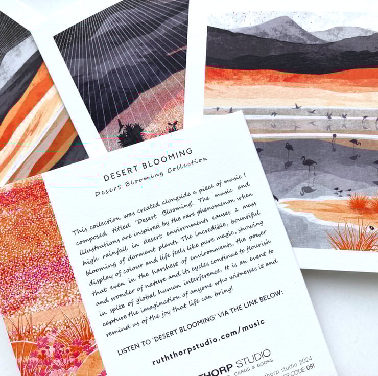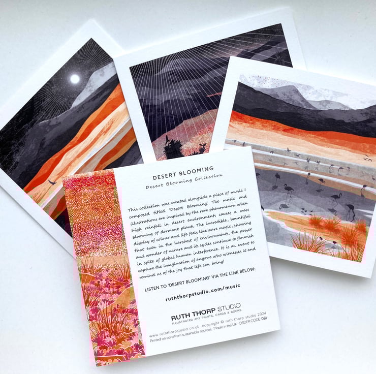 This collection was created alongside a piece of music I composed titled ‘Desert Blooming’. The music and illustrations are inspired by the rare phenomenon when high rainfall in desert environments causes a mass blooming of dormant plants. The incredible, bountiful display of colour and life feels like pure magic, showing that even in the harshest of environments, the power and wonder of nature and its cycles continue to flourish in spite of global human interference. It is an event to capture the imagination of anyone who witnesses it and remind us of the joy that life can bring!