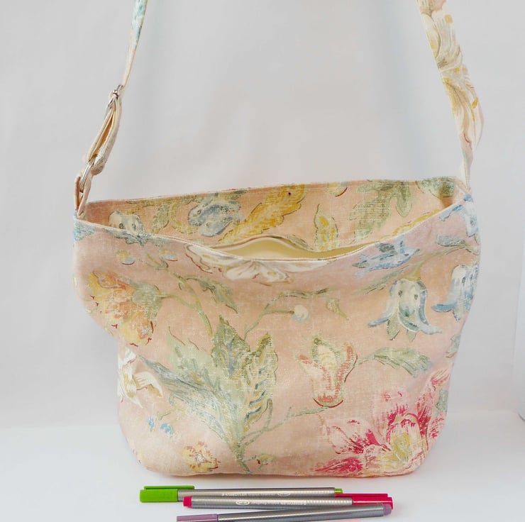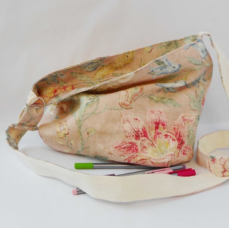 Zip fastening large shoulder bag in 100% linen. Fabric is Tapestry Garden in Old Pink by Colefax and Fowler