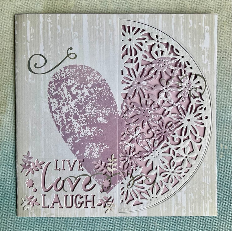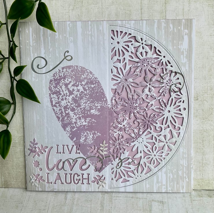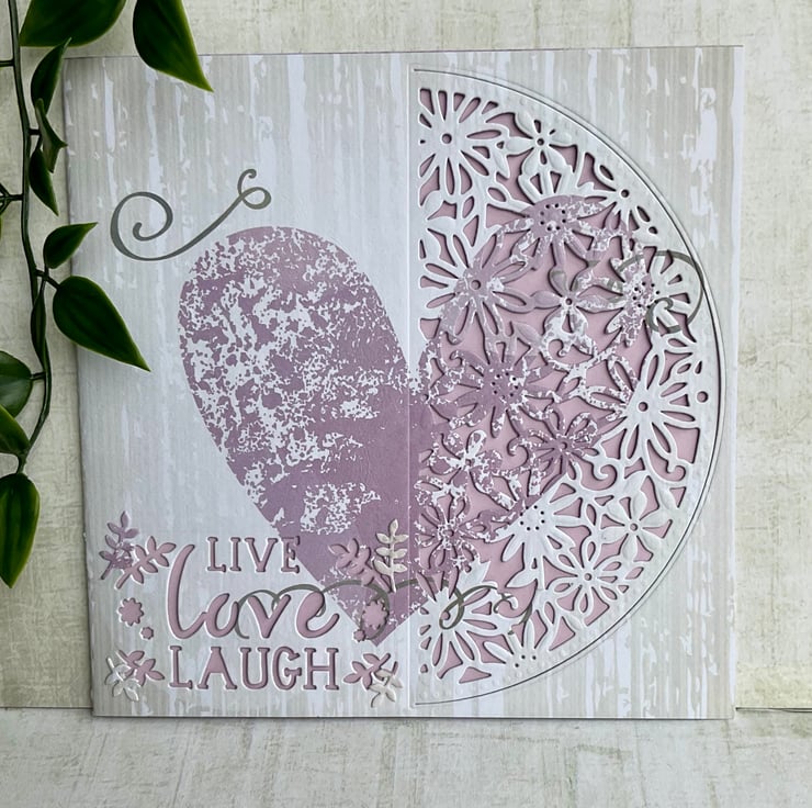 This pretty card has been made using a printed card background featuring a purple heart design. The card has been die cut with an intricate floral pattern. The words Live, Love, Laugh have also been added.