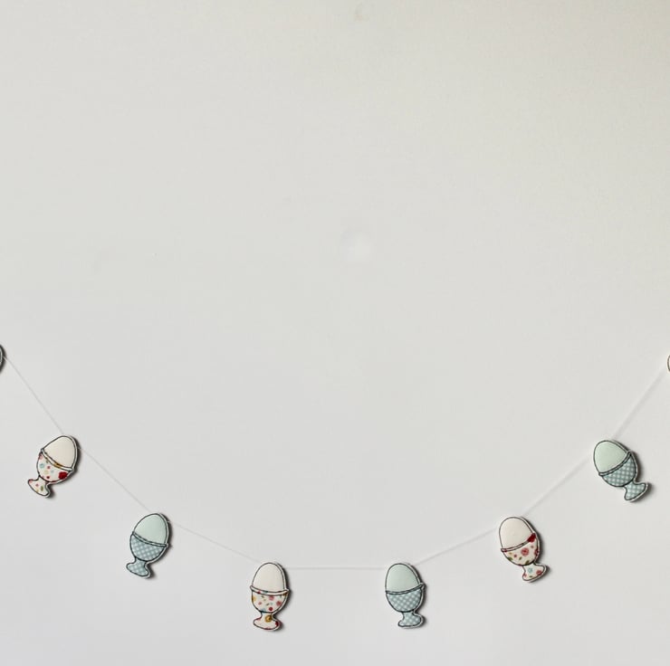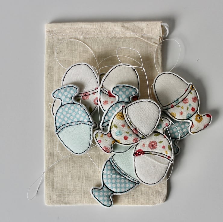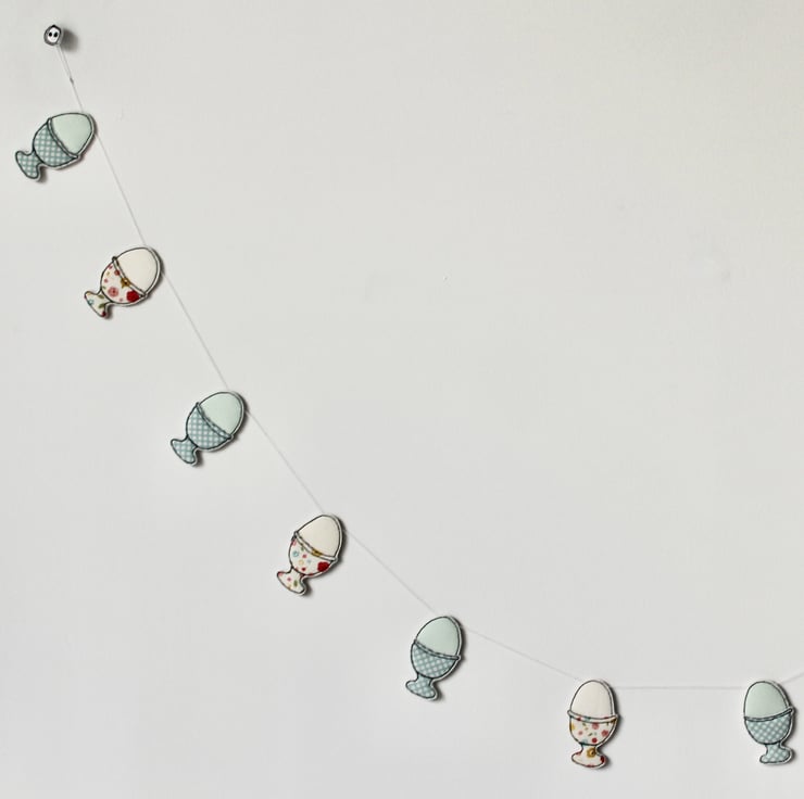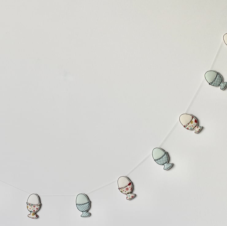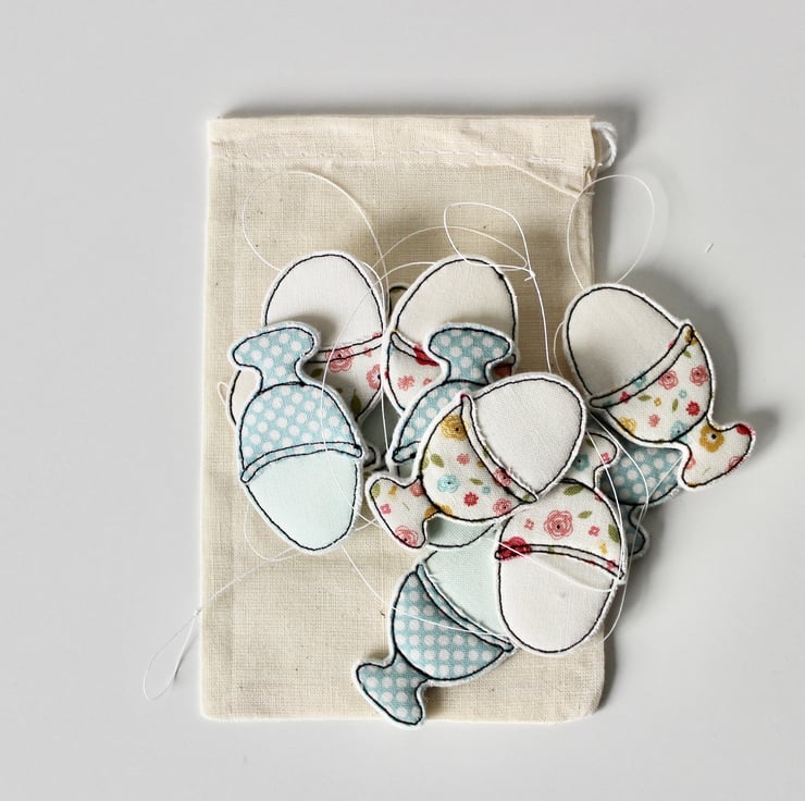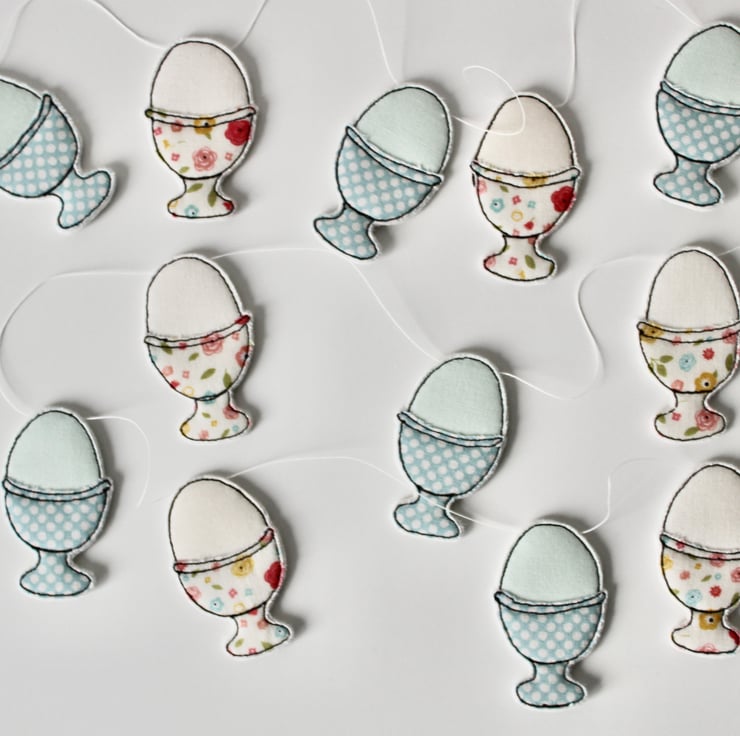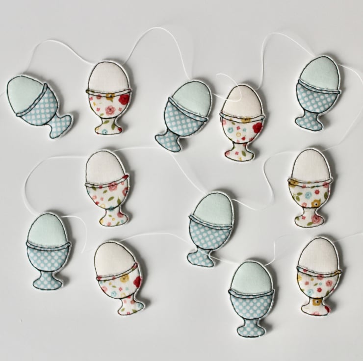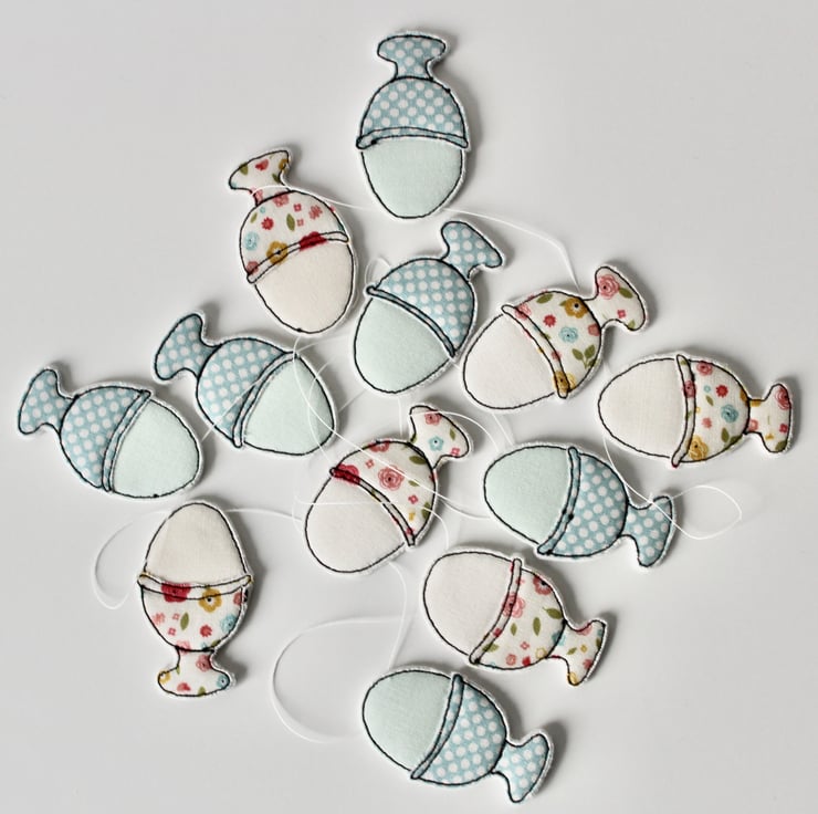 Each of the twelve eggcups suspended along this garland, is sewn using a combination of cotton cloth, 100% wool felt and free hand machine embroidery; multiple layers of cloth are sewn together and cut out by hand using very sharp scissors.