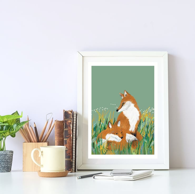 My Meadow Foxes art print features a pair of foxes nestled in a peaceful meadow, against a serene green background. Perfect for a nursery, playroom, or any living space, this print makes a unique and heartwarming gift for fox lovers and art enthusiasts alike.