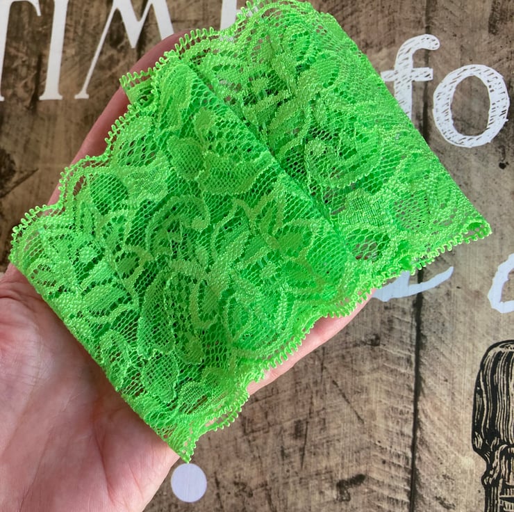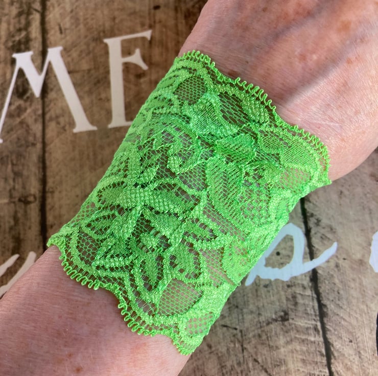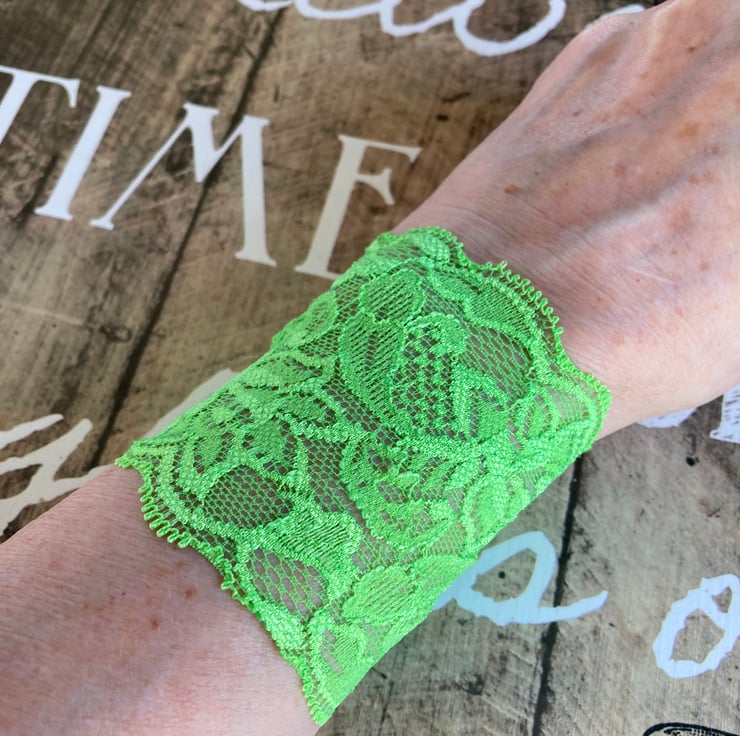 Bright green retro colour lace cuff wristbands, sold as a pair.