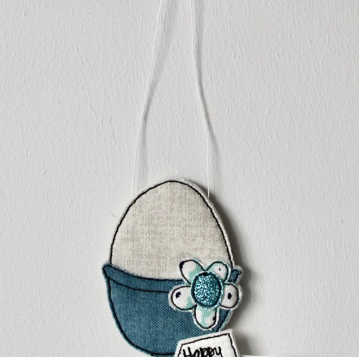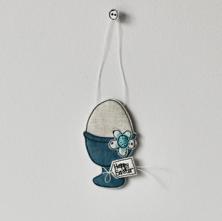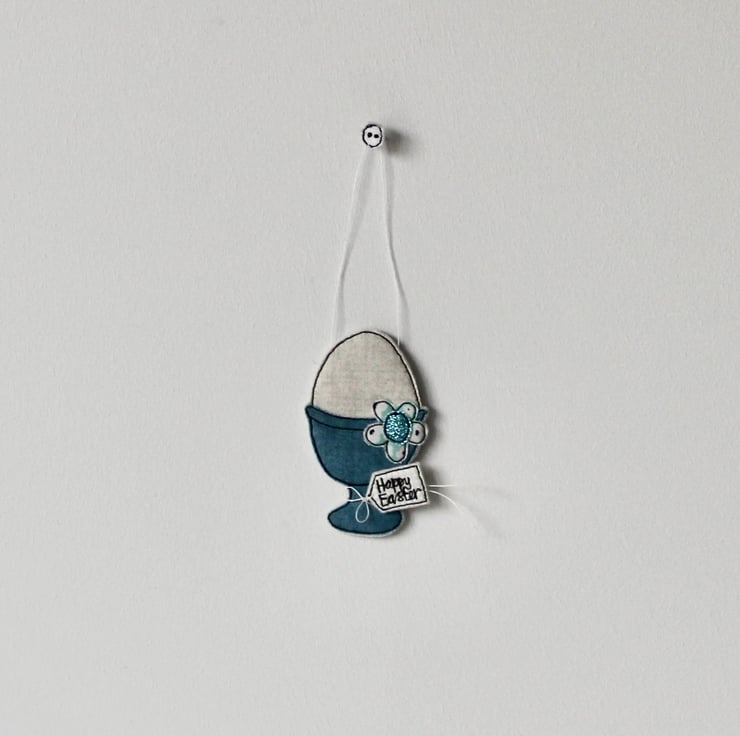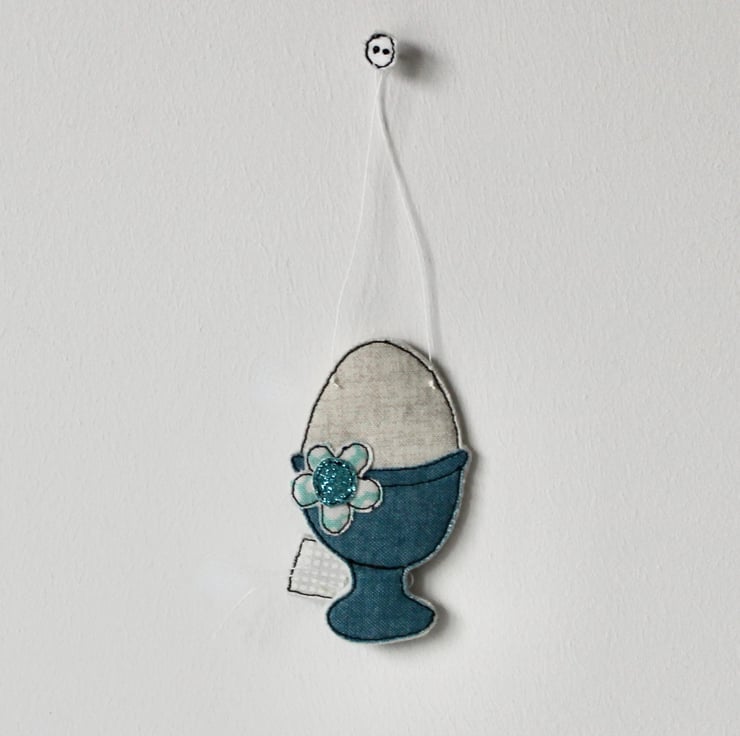 Each eggcup is sewn using a combination of cotton cloth, 100% wool felt, glitter cloth and free hand machine embroidery; multiple layers of cloth are sewn together and cut out by hand using very sharp scissors.