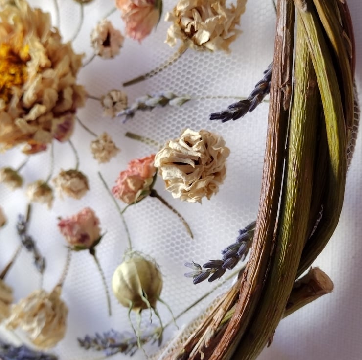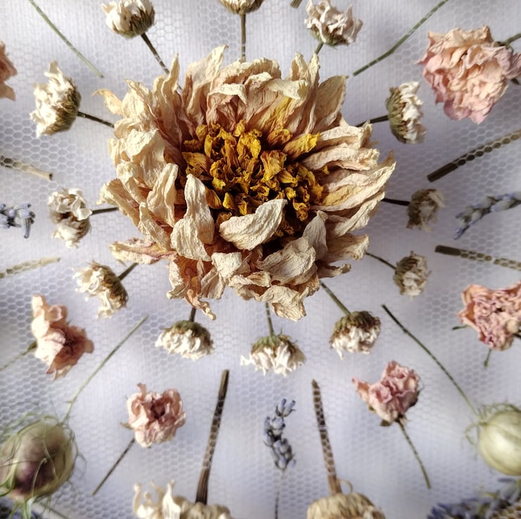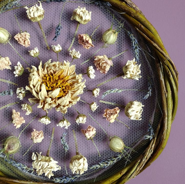 This unique wall hanging comprises of dried flowers carefully woven and stitched onto white tulle, mounted between two twisted willow hoops. The flowers have been organically grown in peat free compost, picked and dried right here from our wildlife friendly garden in the Fens. The willow is also from our garden.