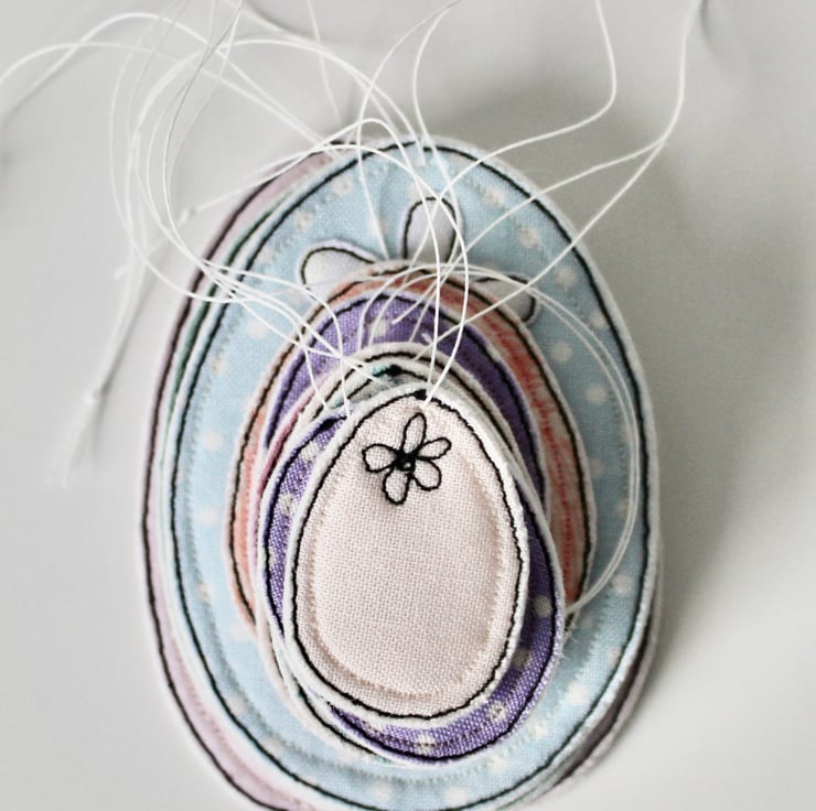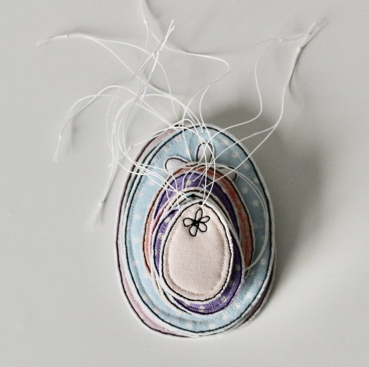 Each egg is sewn using 100% wool felt, cotton cloth and free hand machine embroidery; multiple layers of cloth are sewn together and cut out by hand using very sharp scissors. With a linen string to suspend.