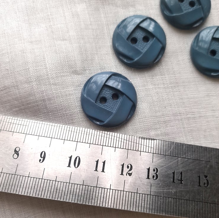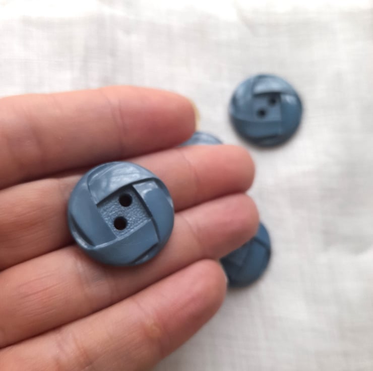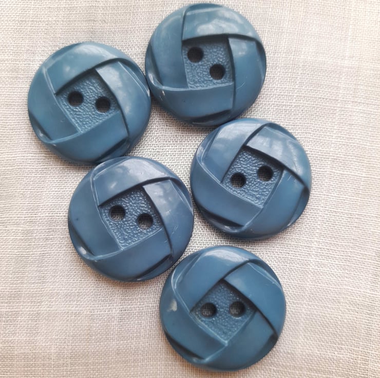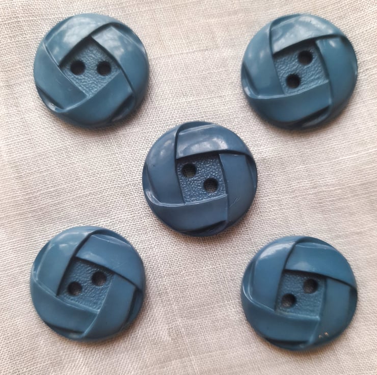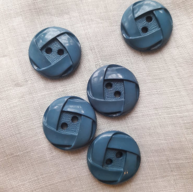 Pack of 5 vintage blue buttons with a raised celtic knot pattern, 2 stitch holes, flat backed. They measure 23mm in diameter. Nice large buttons.