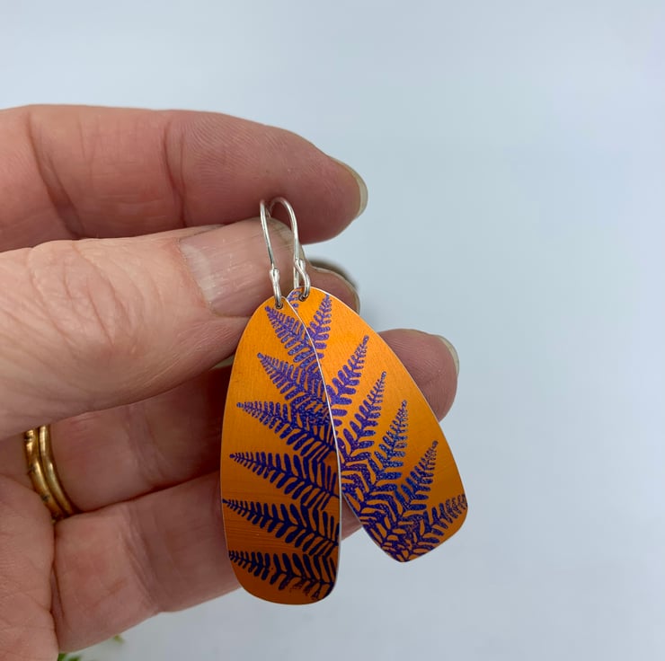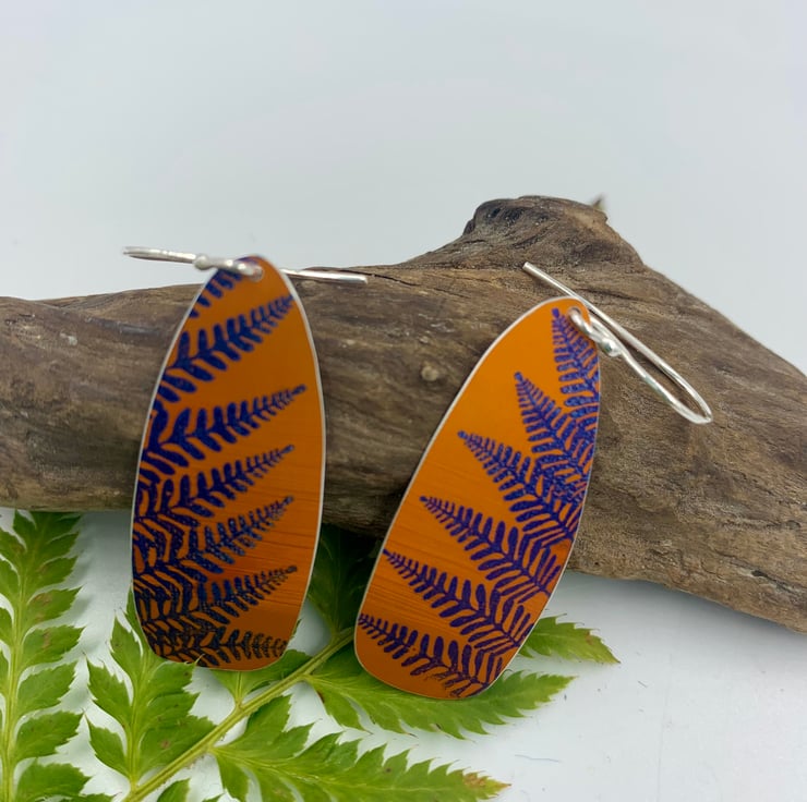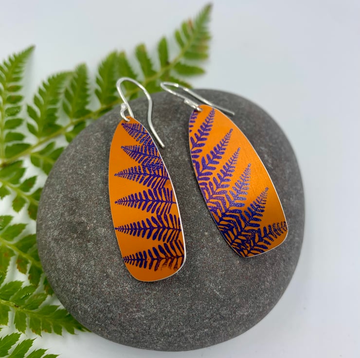 These bright and bold dangly earrings are made from anodised aluminium which has been hand printed with a beautiful fern leaf design in navy blue. The metal was dip dyed orange.