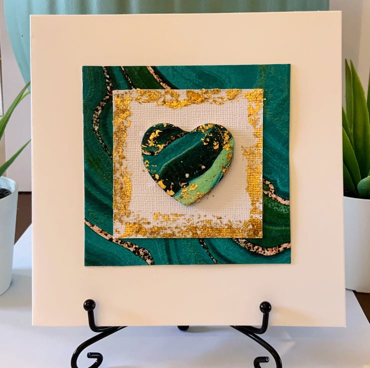 A lovely wood heart has been decoupaged with fine art paper mounted on white embossed card with gold leaf and mounted on the same design art paper in shades of greens and gold in a marble effect design.