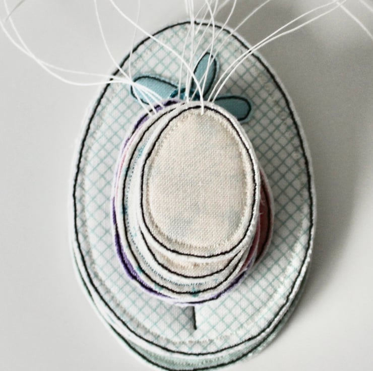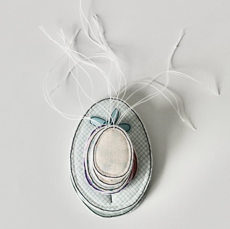 Each egg is sewn using 100% wool felt, cotton cloth and free hand machine embroidery; multiple layers of cloth are sewn together and cut out by hand using very sharp scissors. With a linen string to suspend.