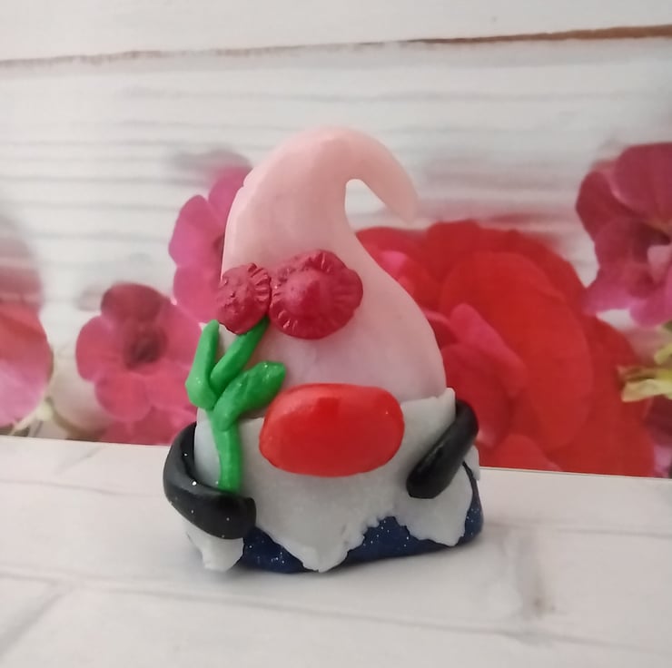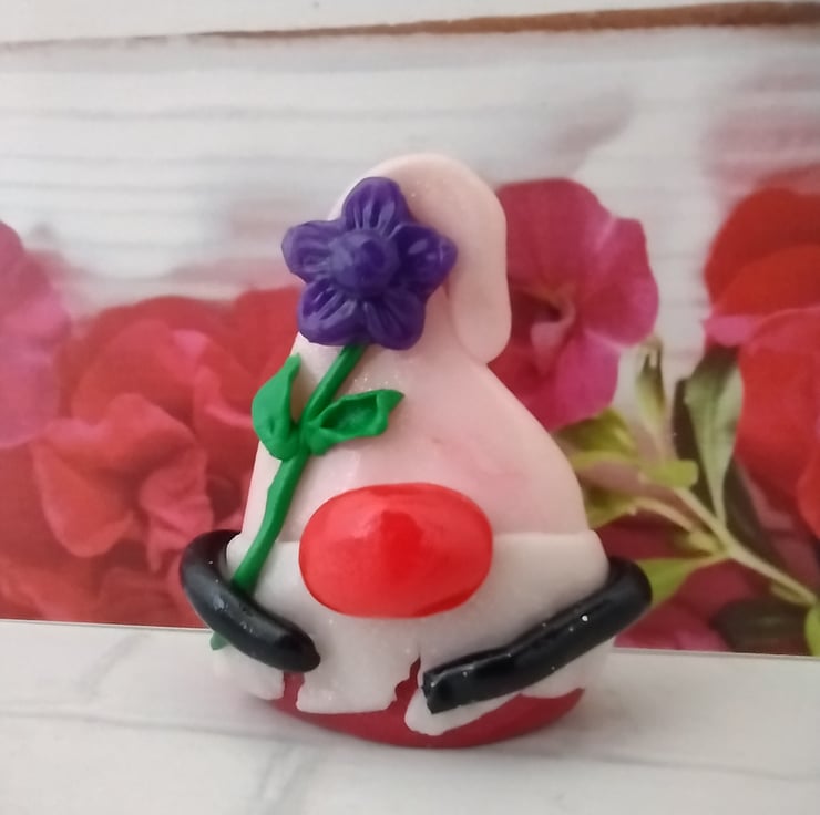 Nearly six cm high, each gnome is made from some bright spring summer colours, and is free standing, but fairly lightweight for posting. They are holding little flowers, and are full of spirit and charm.
