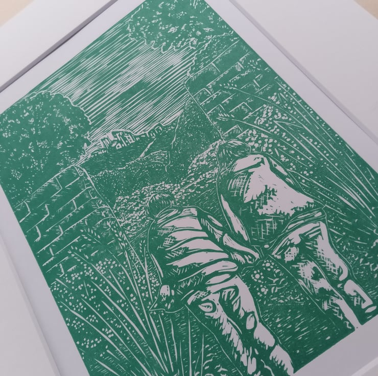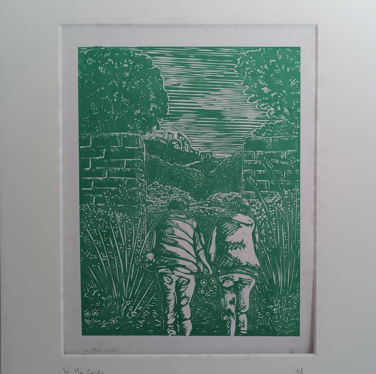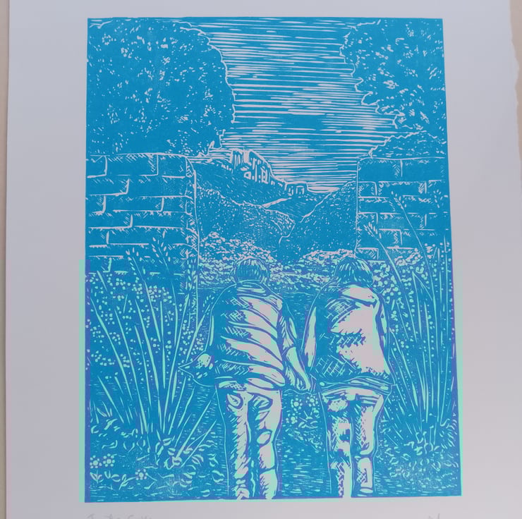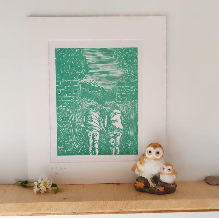 Linoprint showing a couple walking through a garden towards an opening, beyond are hills and a ruined castle. It is printed in green ink on white, mounted in cream. Outer size for framing is 12x10 inches.it is 1 of a limited edition of 50, slightly variable, as the shade of green and the paper may differ.
