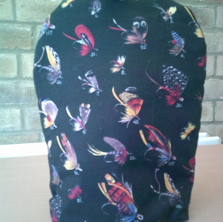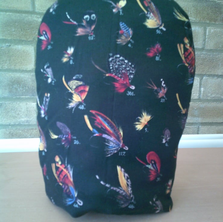 The design of the fabric uses is of brightly coloured fishing flies in red, blue and yellow on a black background.