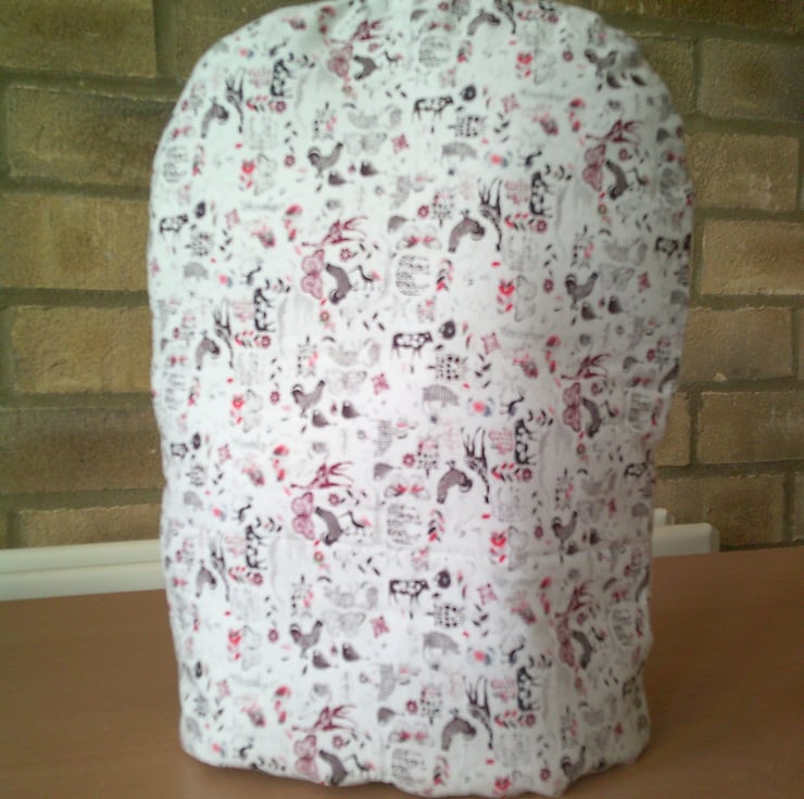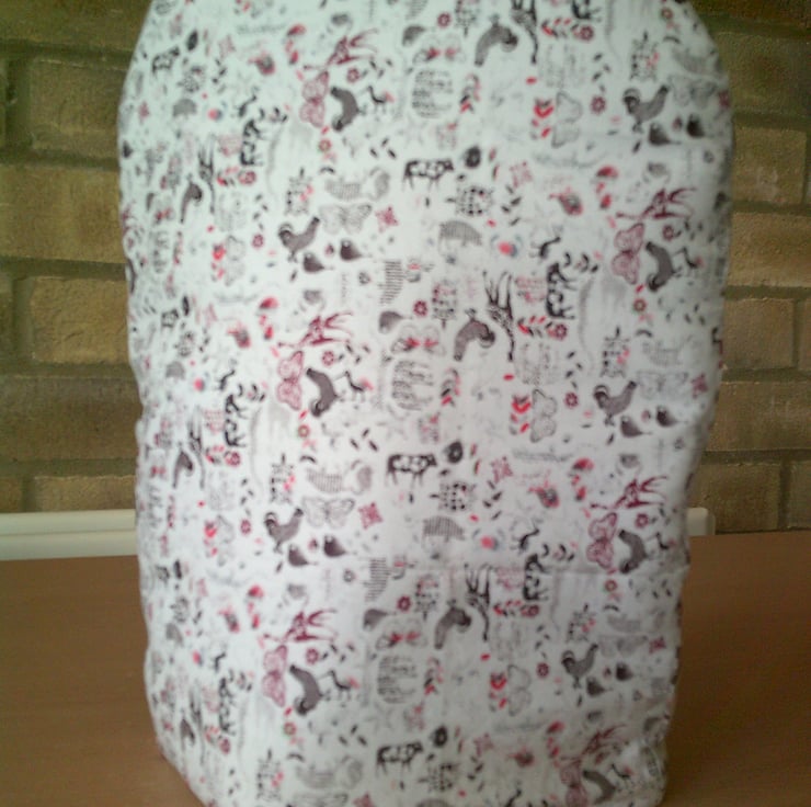 The design of the fabric used is of a variety of small animals including butterflies, birds, chickens and cows on a white background.