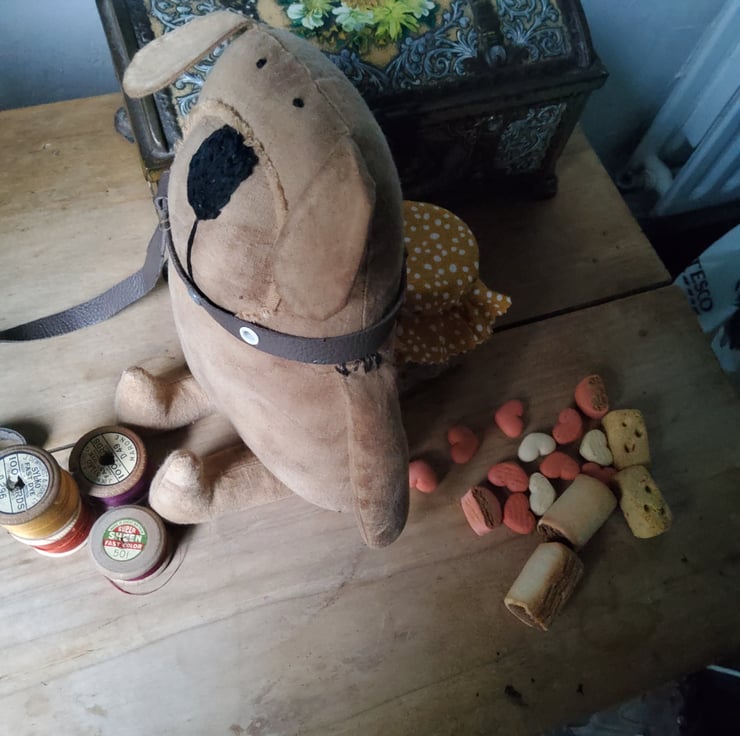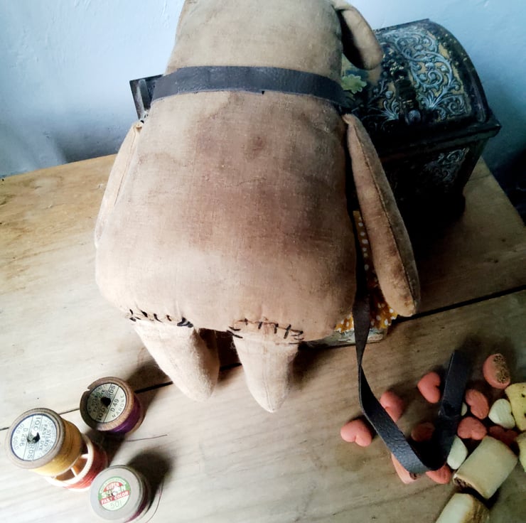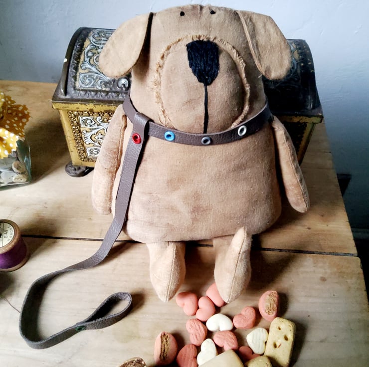 Prim Dog is made from coffee and cinnamon dyed calico fabric - sanded for a care worn appearance - Dog thought that it tickled ( a lot) ! He has embroidered features and his arms and legs have been stitched randomly using black embroidery thread. His lead and collar are made from leather with different coloured eyelets for decoration. Dog has been stuffed with pure carded wool ( naturally fire retardant).
